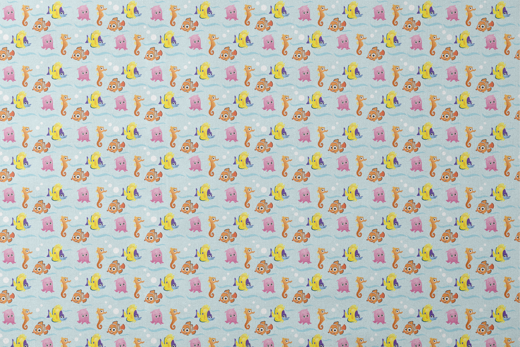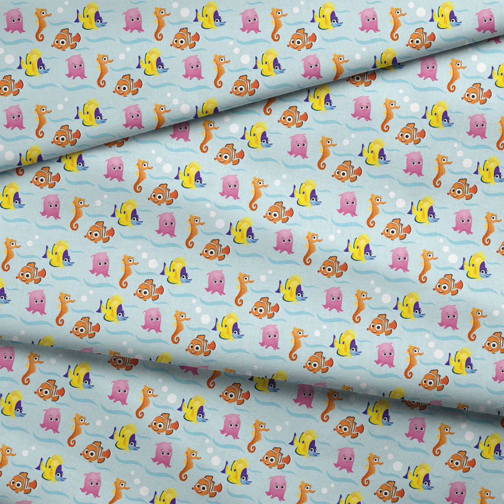 Adorable underwater pattern featuring Disney Finding Nemo and colorful friends in vibrant orange, yellow, and pink against a wavy light blue background.