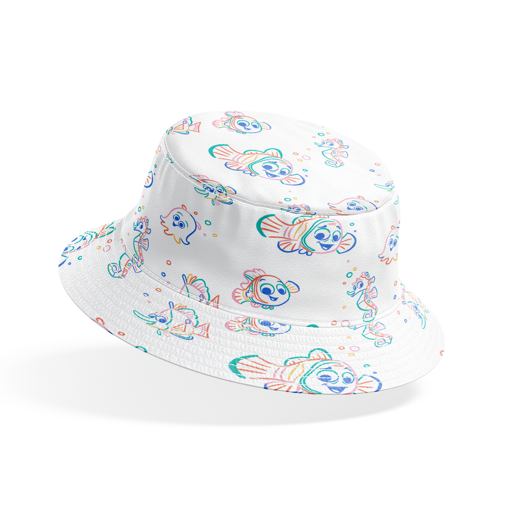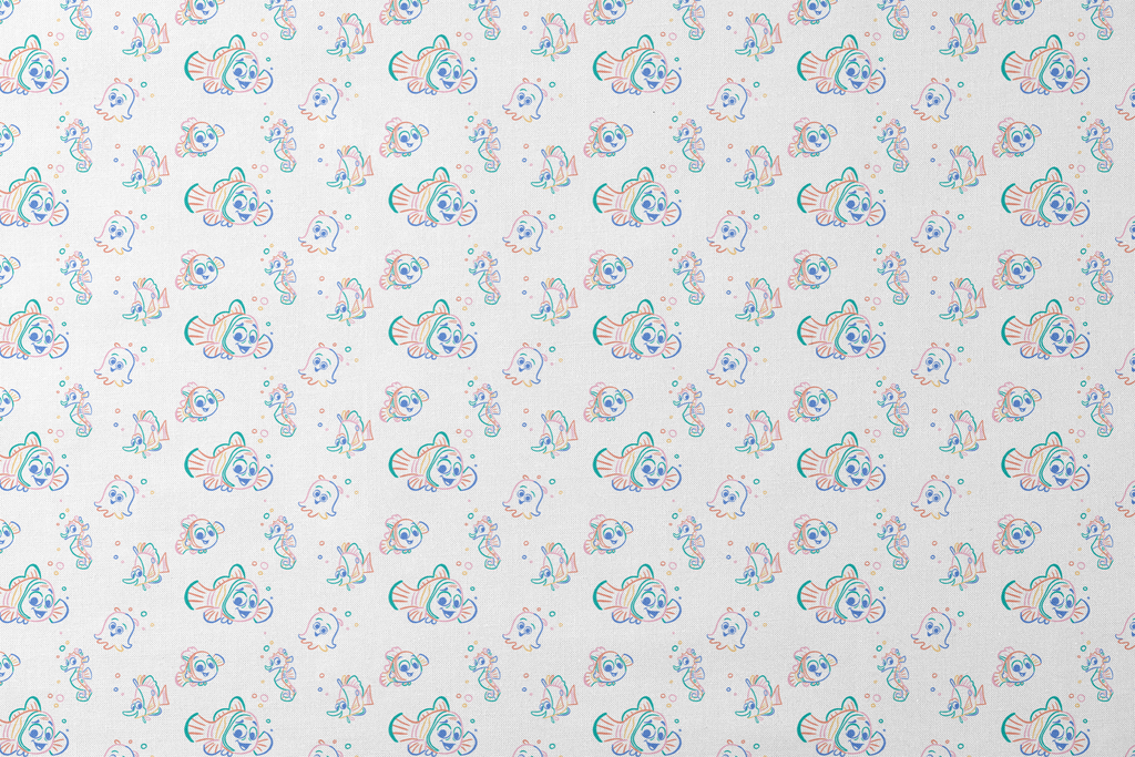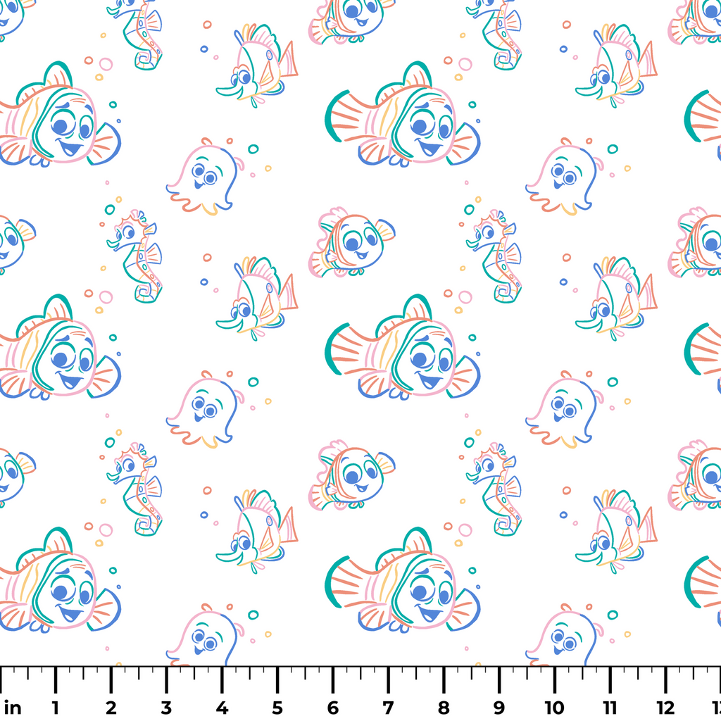 Whimsical undersea Disney Finding Nemo pattern featuring colorful sea friends in a playful outline style with turquoise, blue, coral and pink accents on a clean white background.