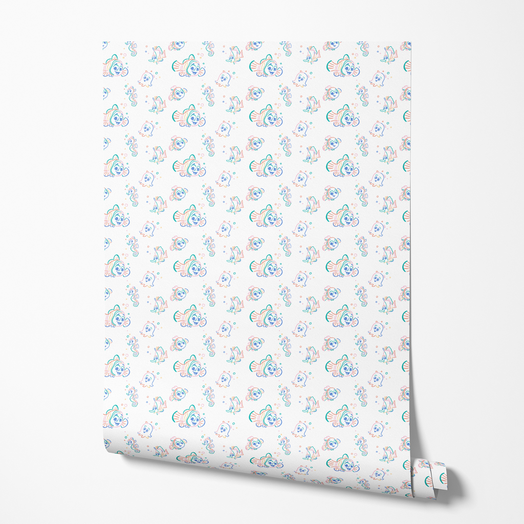 Whimsical undersea Disney Finding Nemo pattern featuring colorful sea friends in a playful outline style with turquoise, blue, coral and pink accents on a clean white background.
