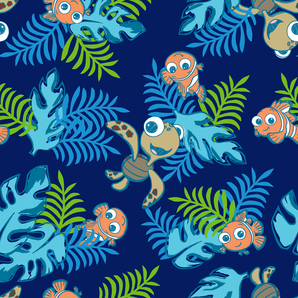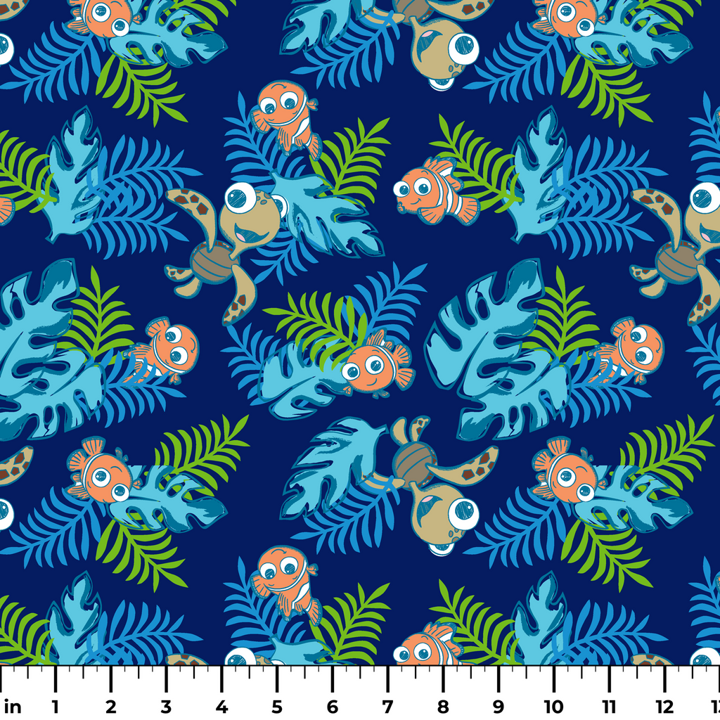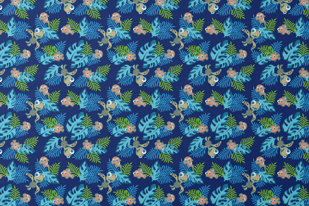 Vibrant blue underwater pattern featuring Disney Finding Nemo and tropical green foliage creates a playful marine theme perfect for children's apparel or home decor.