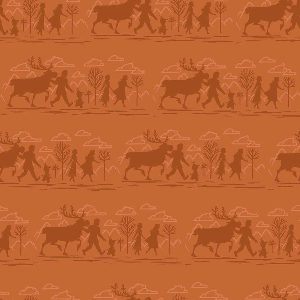 This rustic brown-colored print features silhouettes of deer, Frozen characters, and trees in a traditional folk art style, creating a warm, earthy pattern perfect for heritage-inspired home decor with a Disney twist.