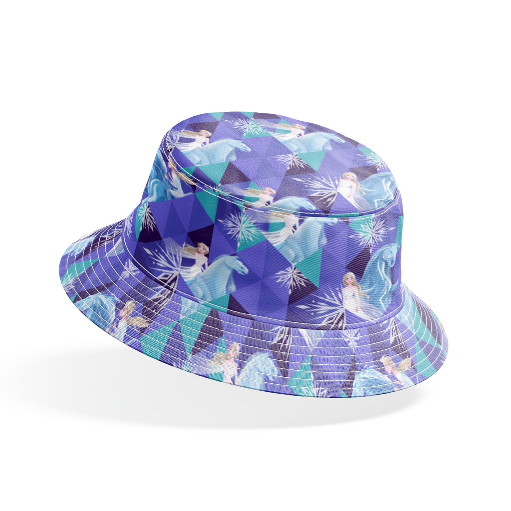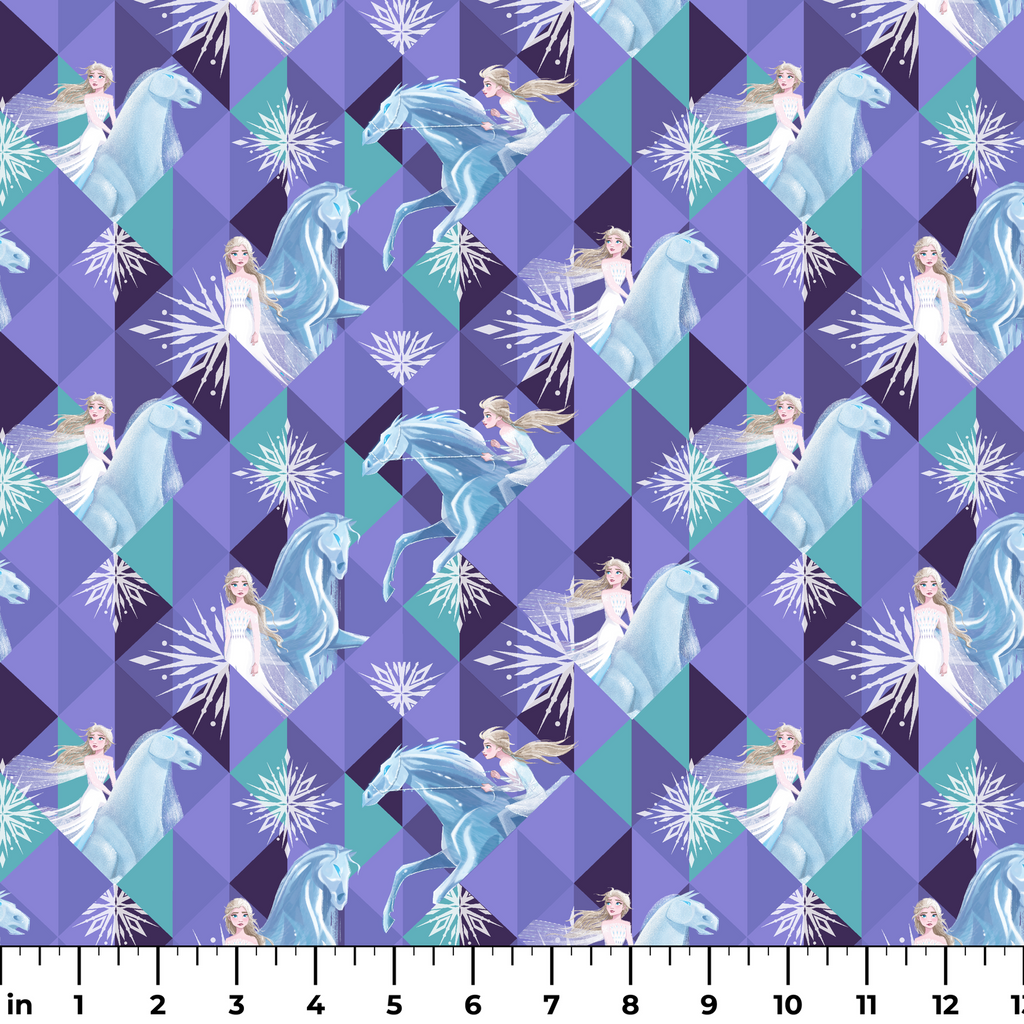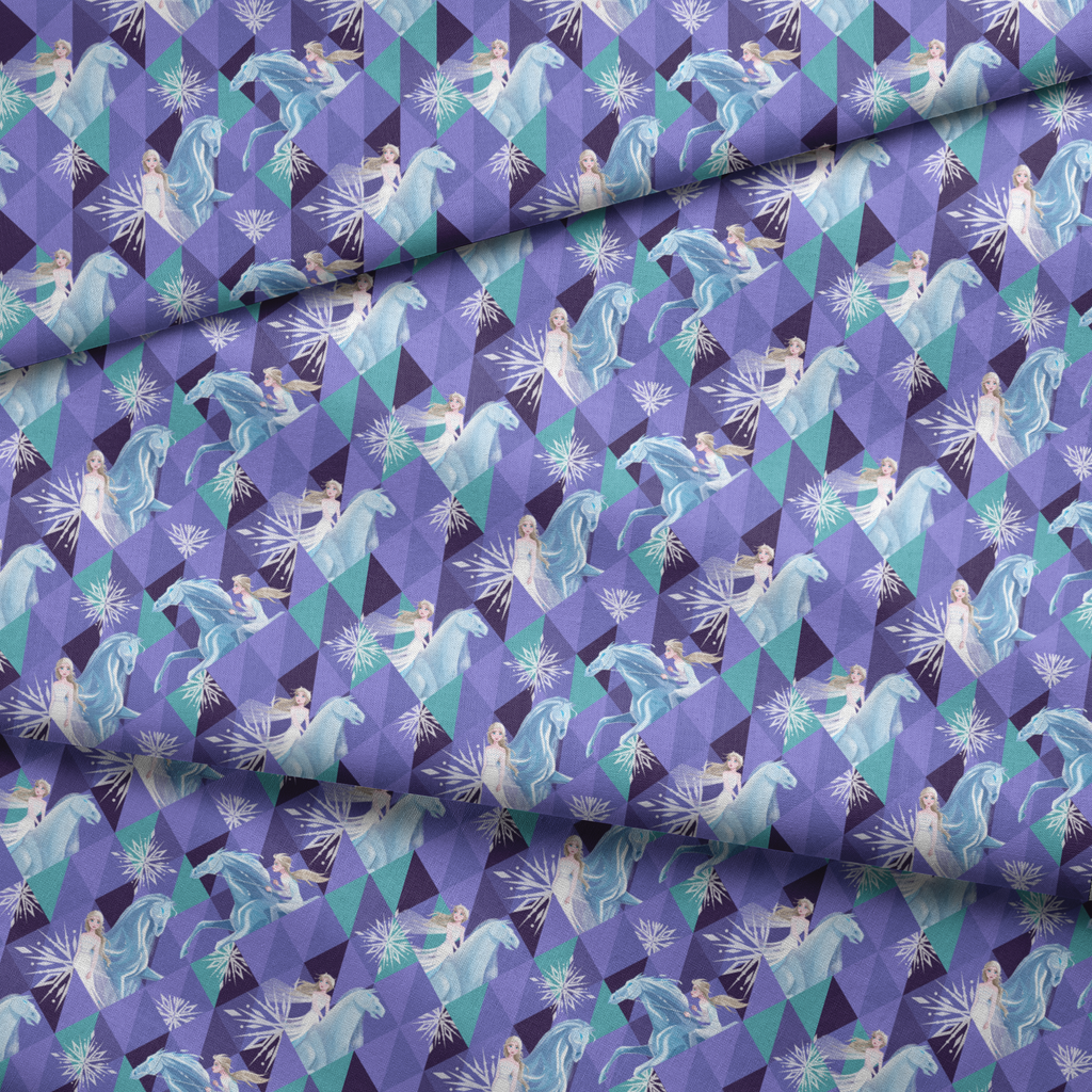 Disney Frozen pattern featuring enchanted equines and Elsa on a geometric purple and teal background. Perfect for fantasy-themed quilting projects or winter decor.