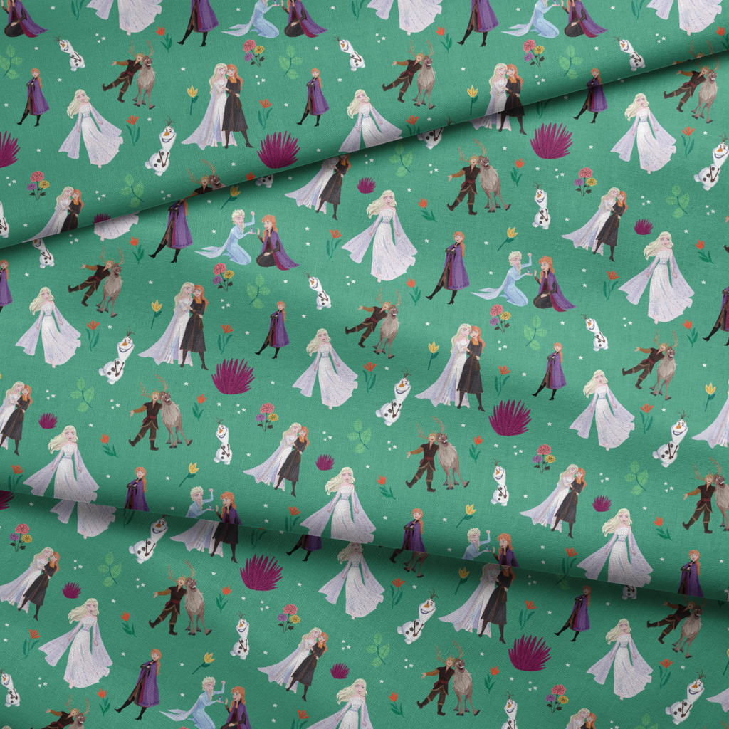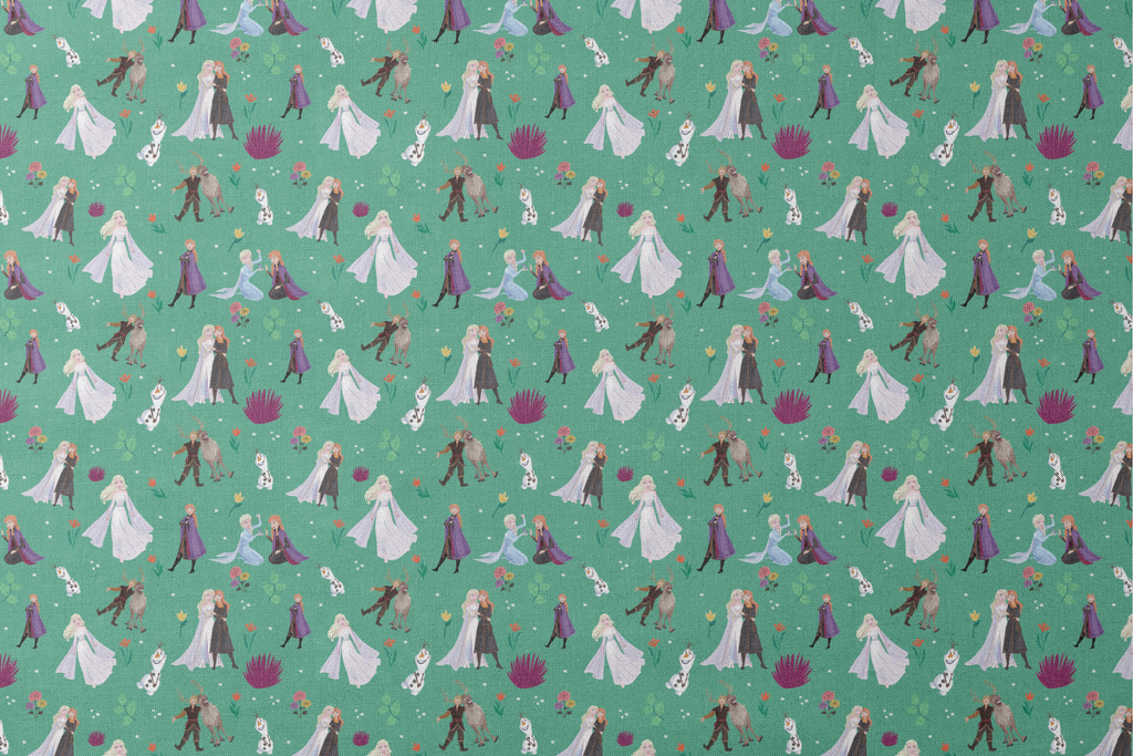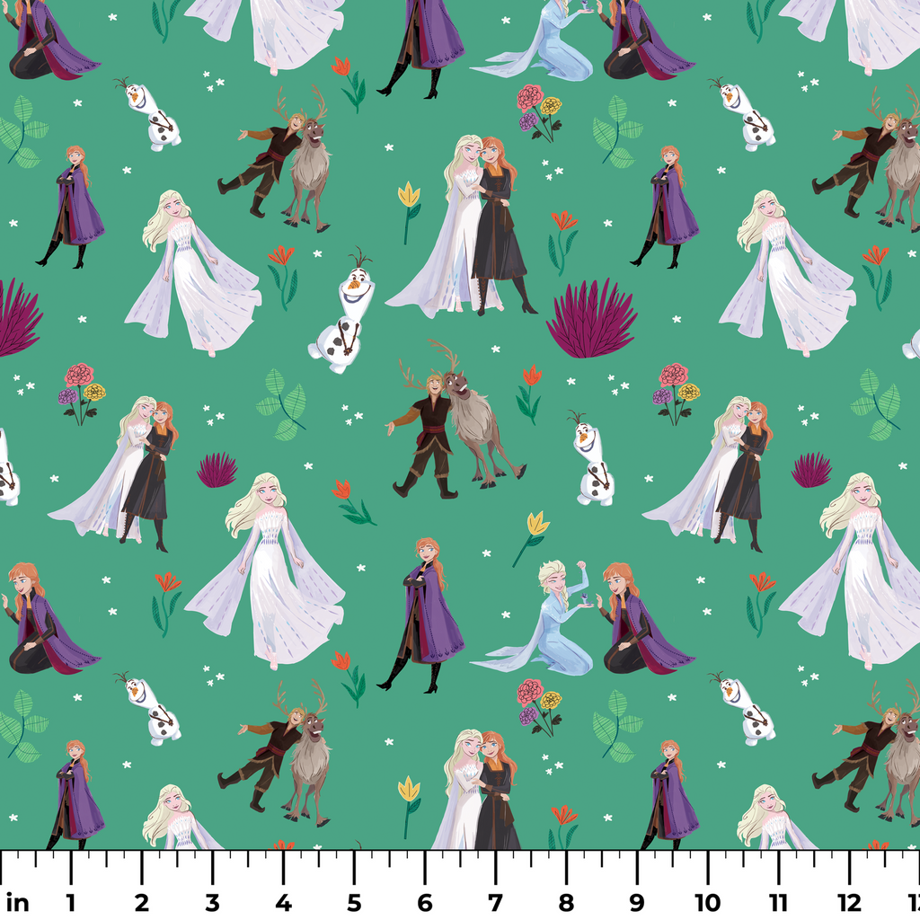 This enchanting Disney Frozen pattern features Elsa, Anna, Olaf, and Kristoff on a vibrant green background with colorful florals - perfect for fans of the beloved animated film.