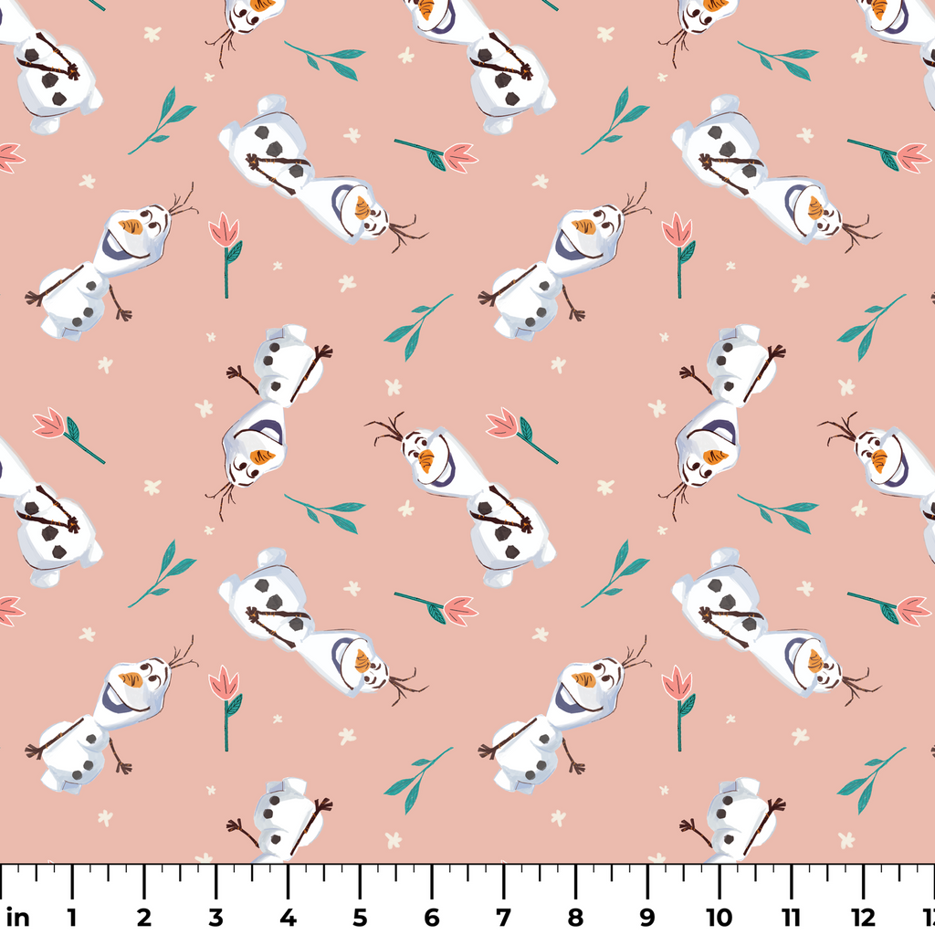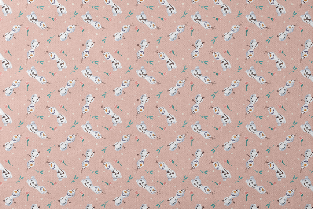 Adorable Frozen pattern featuring Olaf on a soft peach background with delicate green foliage and tiny white snowflakes. Perfect for winter-themed home decor or holiday crafting projects.