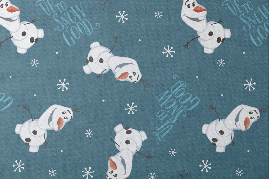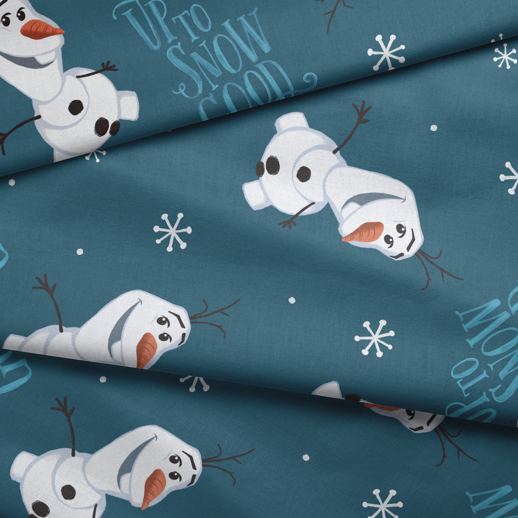 Adorable Disney Frozen pattern on teal background featuring Olaf alongside "Up to Snow Good" text. Perfect for cozy holiday home decor or festive apparel.