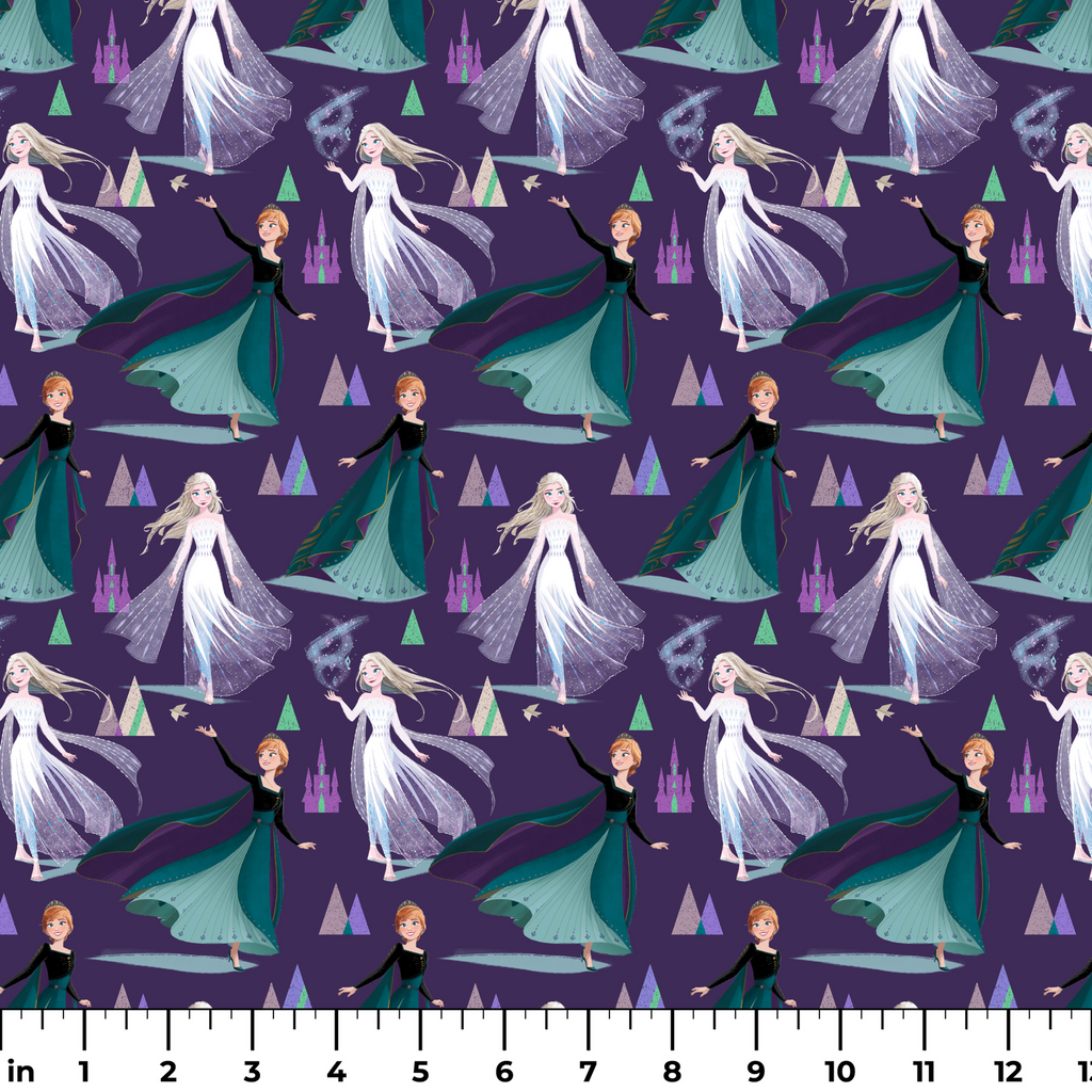 Enchanting Frozen-inspired pattern featuring Elsa, Anna, and castles on a deep purple background, perfect for fans of the beloved animated film.