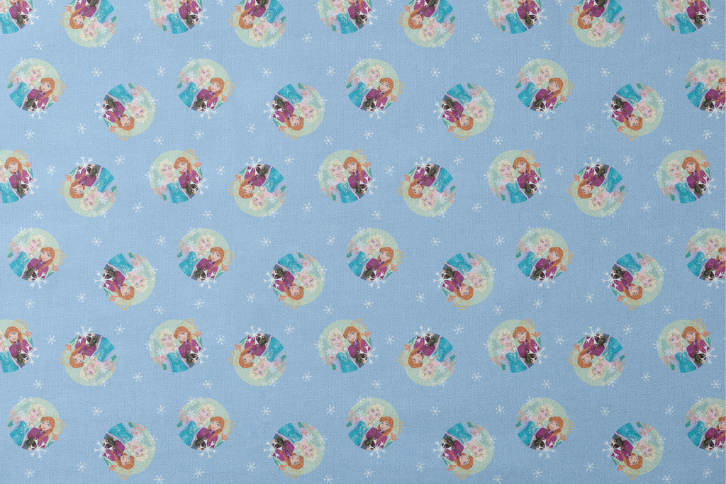 A winter-themed pattern featuring characters from Frozen in circular medallions against a light blue background with delicate snowflakes scattered throughout.