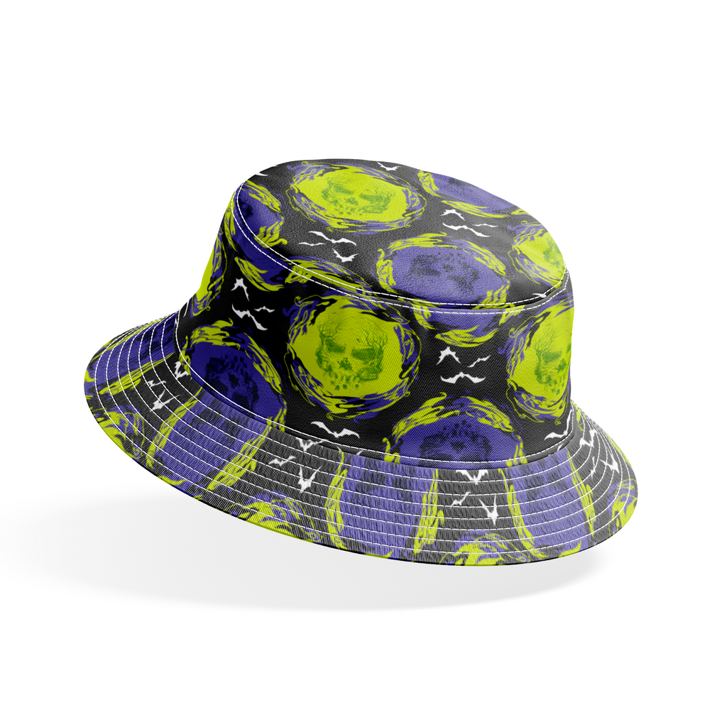 Spooky Disney Haunted Mansion pattern featuring vibrant neon green and purple skulls on a black background with contrasting white bats. Perfect for Halloween apparel or goth-inspired home decor.