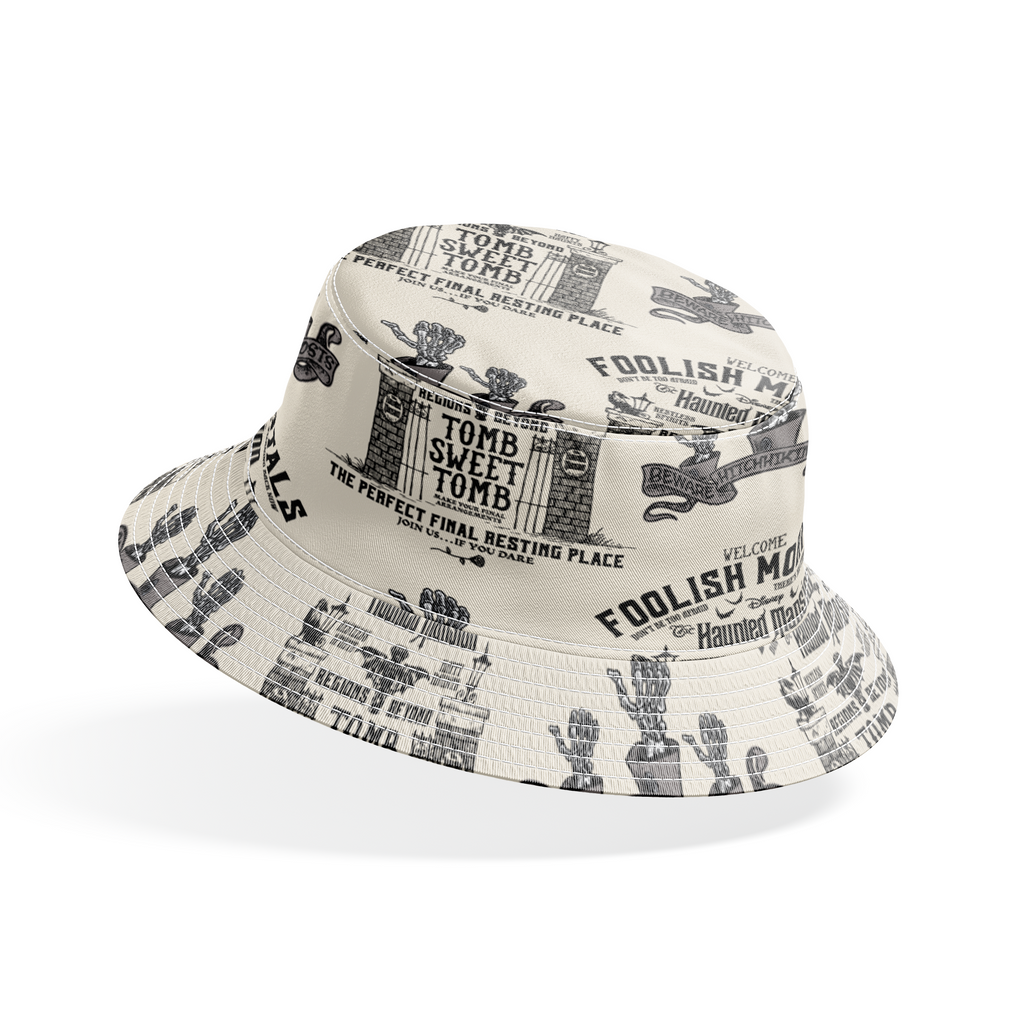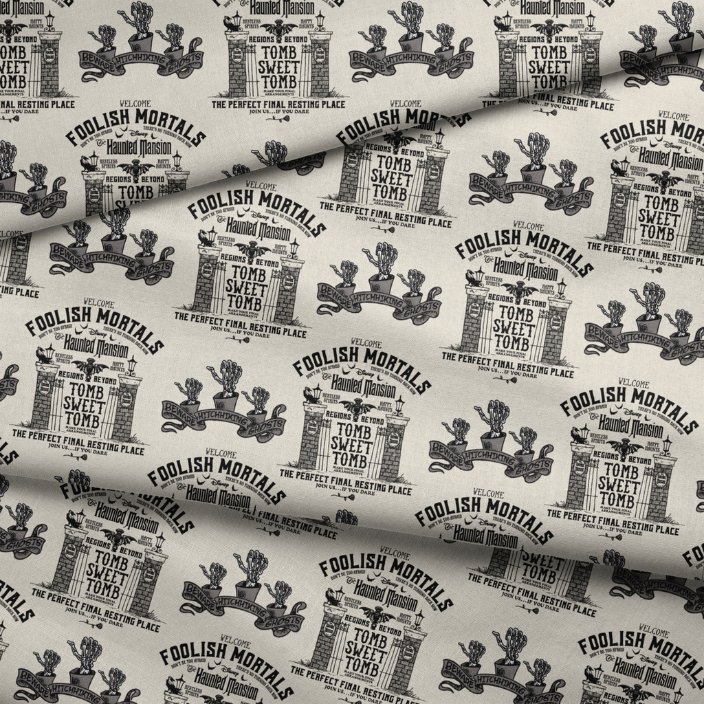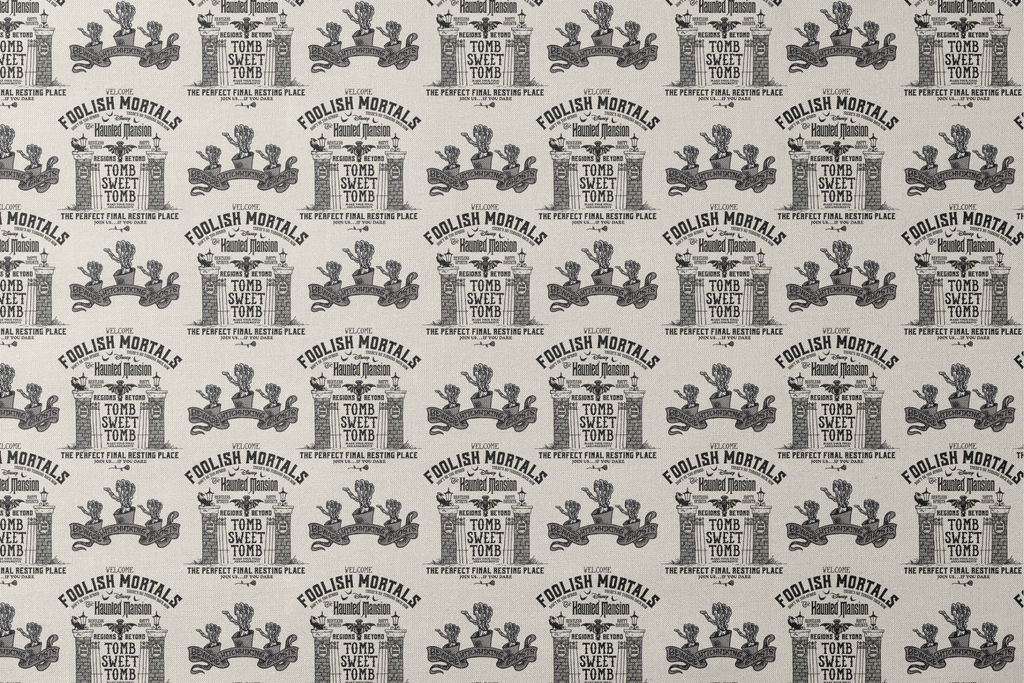 This vintage-inspired design features spooky elements from Disney's Haunted Mansion attraction, complete with gothic typography and tombstone imagery in a classic black and cream color scheme.