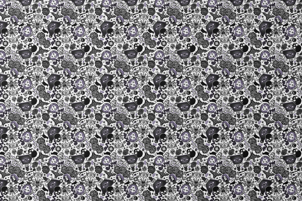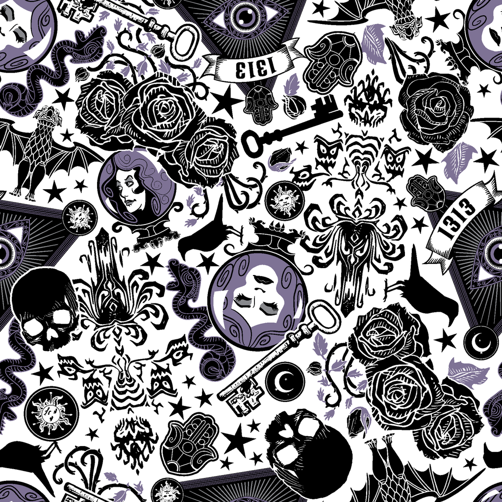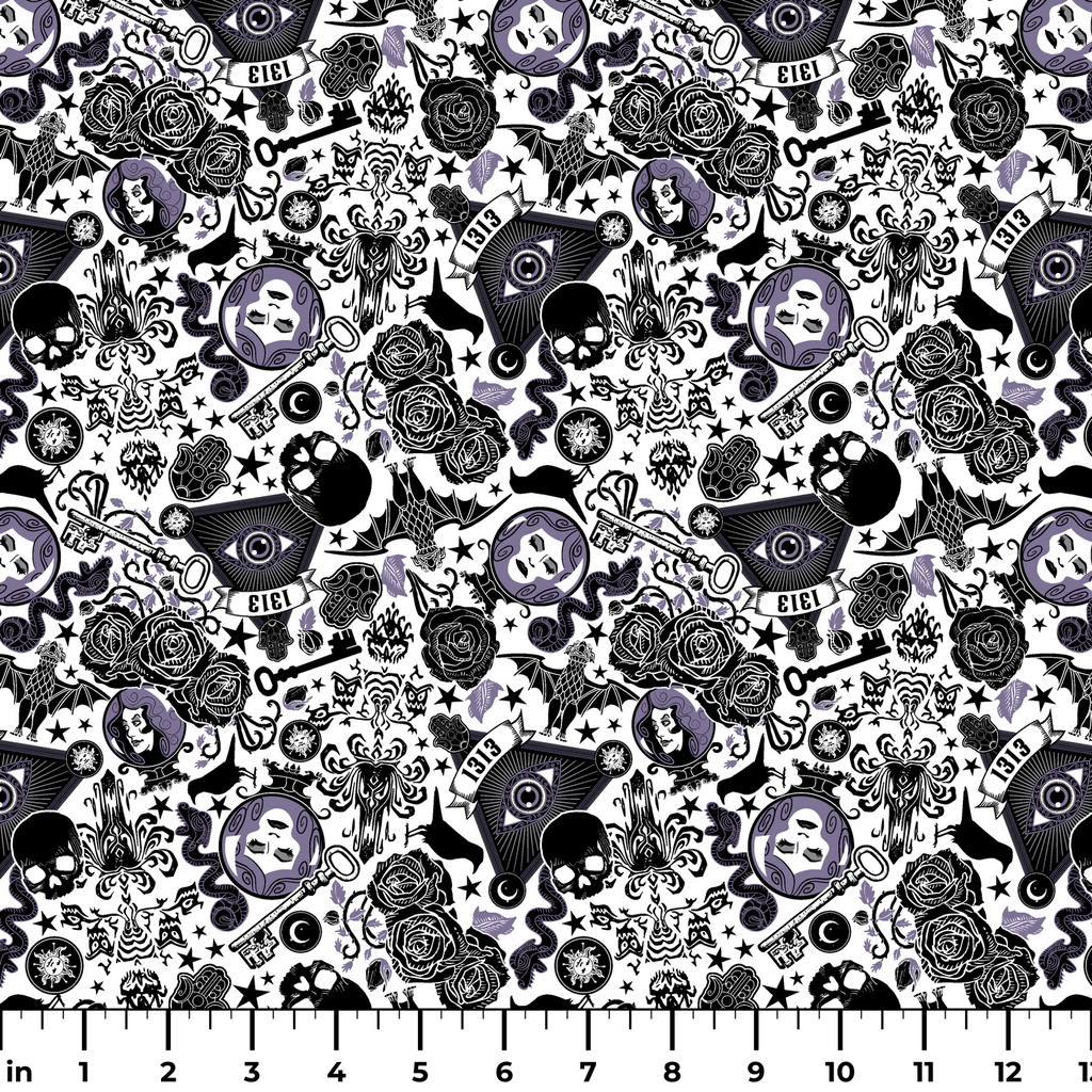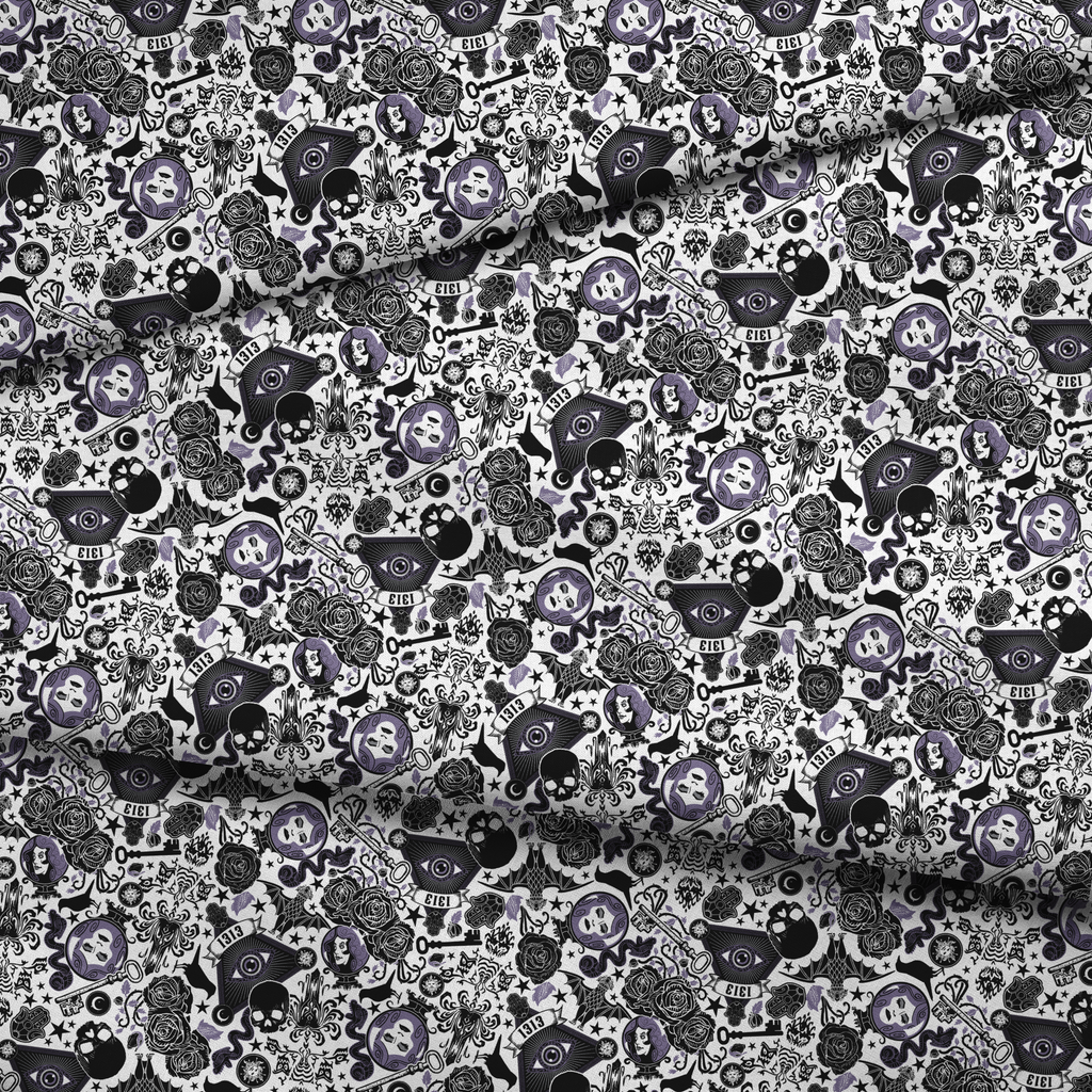 Disney Haunted Mansion-inspired pattern featuring dark elegant roses, vintage frames, and mystical symbols in a striking black and purple color scheme. Perfect for alternative fashion and home decor accents.