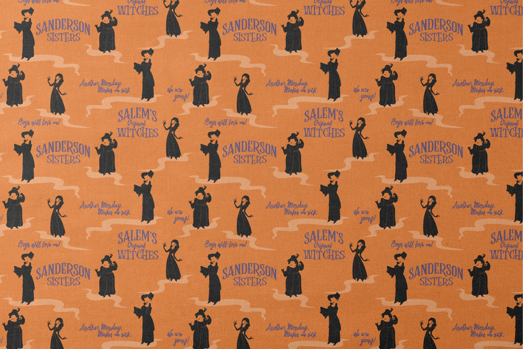 Enchanting Disney Hocus Pocus pattern featuring Sanderson Sisters from Salem, perfect for Halloween decor. Orange and blue design captures the whimsical, spooky aesthetic of this beloved cult classic.
