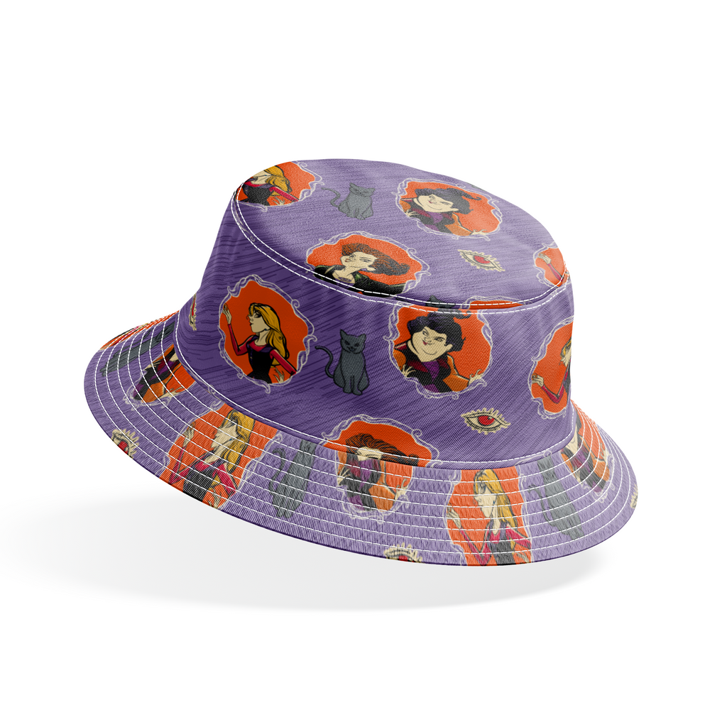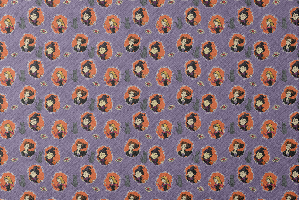 Spooky Disney pattern featuring Hocus Pocus witches, black cats, and mystical eyes - perfect for Halloween decor or gothic fashion that celebrates the witchy aesthetic.
