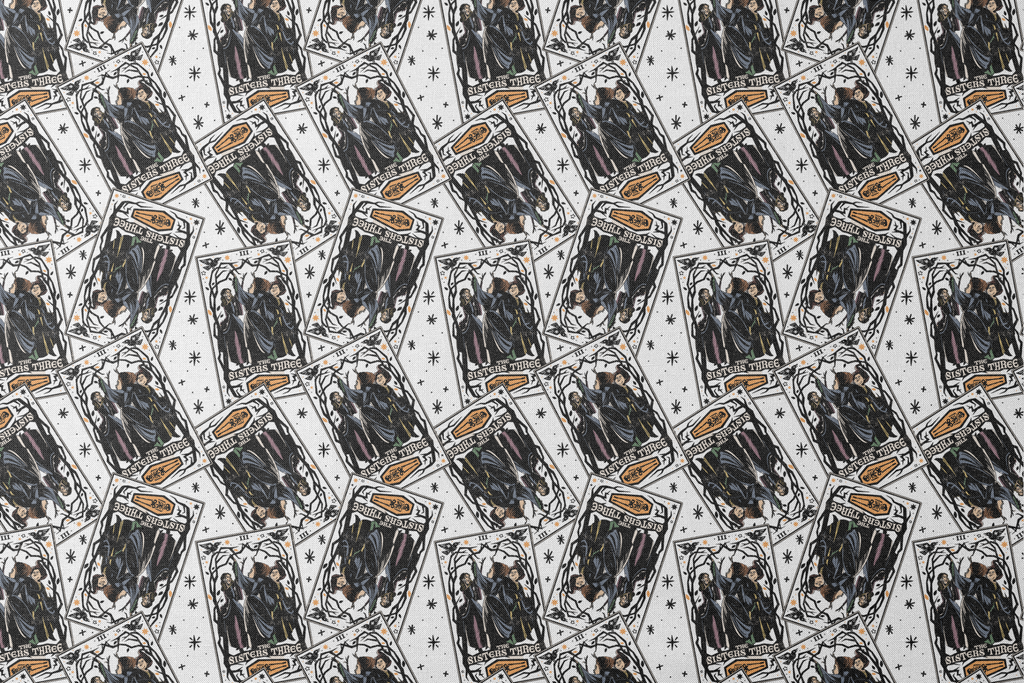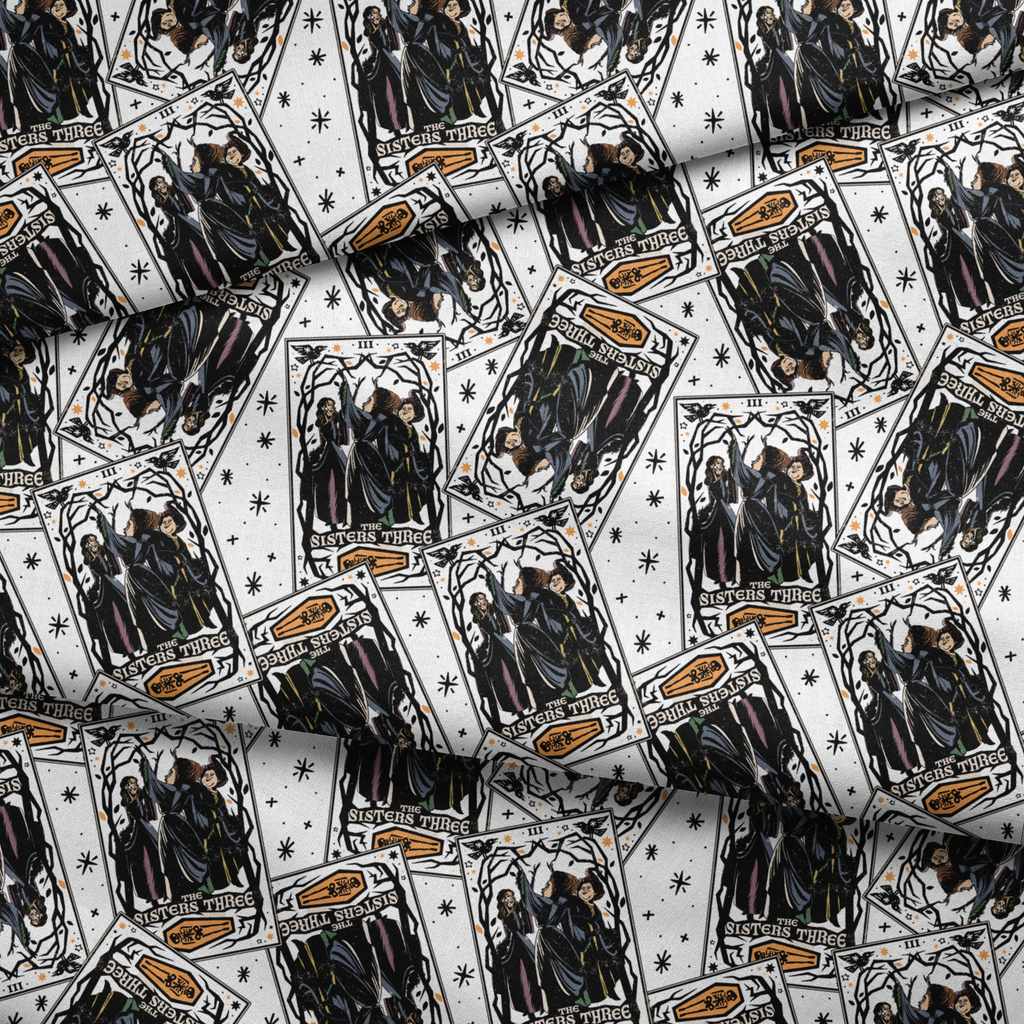 This Disney Halloween illustration features Hocus Pocus card designs with mystical figures in dark robes against a starry background, perfect for Halloween home decor or collectible prints.