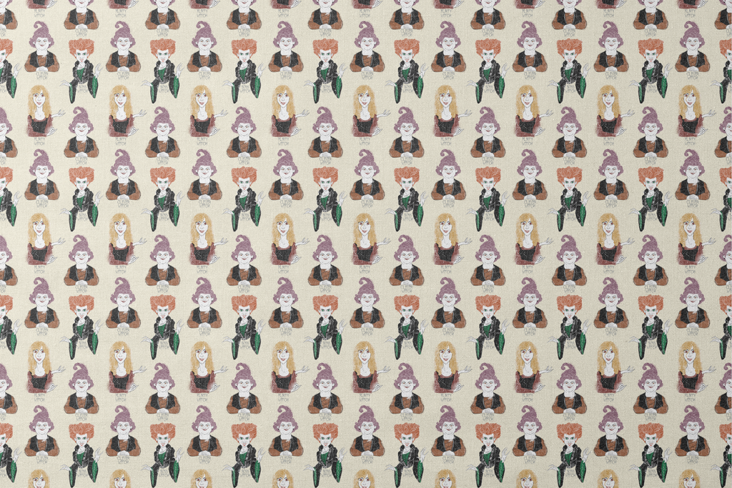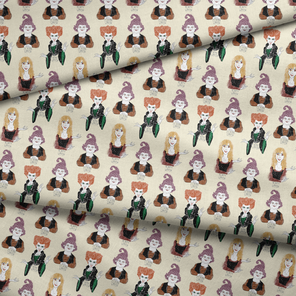 This whimsical Disney pattern features stylized Hocus Pocus witches with distinct personalities and hairstyles in purple, orange, and green, perfect for Halloween décor or spooky-season apparel.