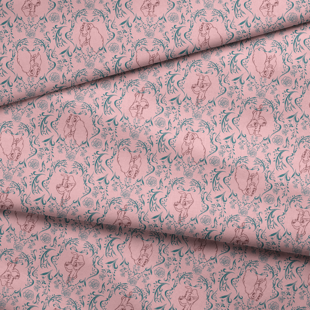 Delicate toss featuring Disney's Lady and the Tramp characters in a vintage-inspired toile with teal floral accents and decorative scrollwork. Perfect for home decor!