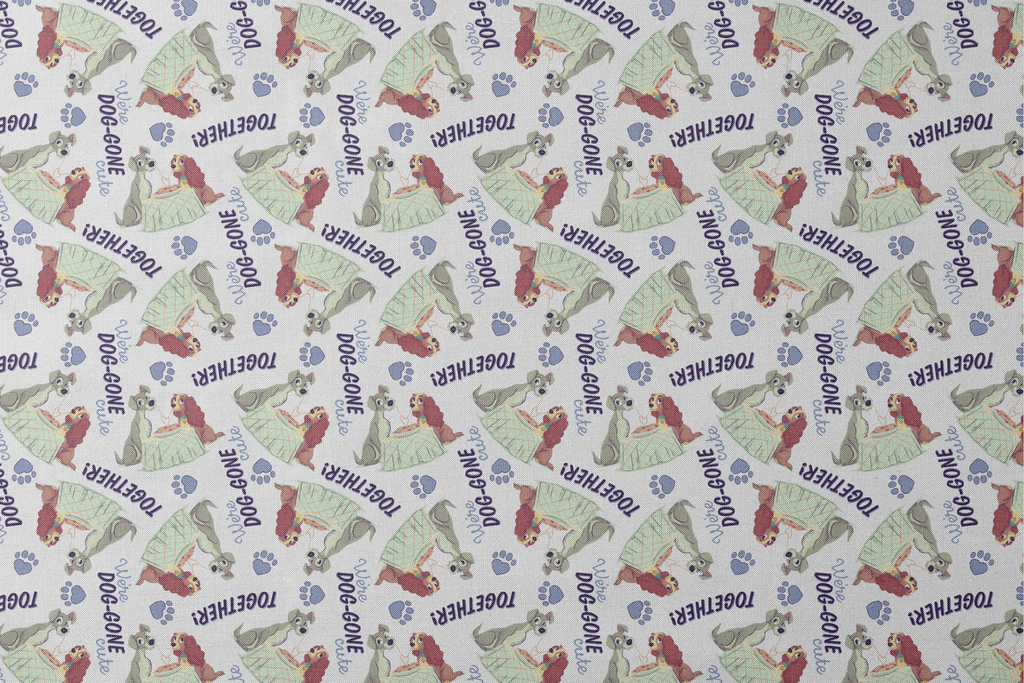 Disney's Lady and the Tramp fabric featuring the iconic dogs on a white background with paw prints. Perfect for quilting projects, children's apparel, or nursery decor.
