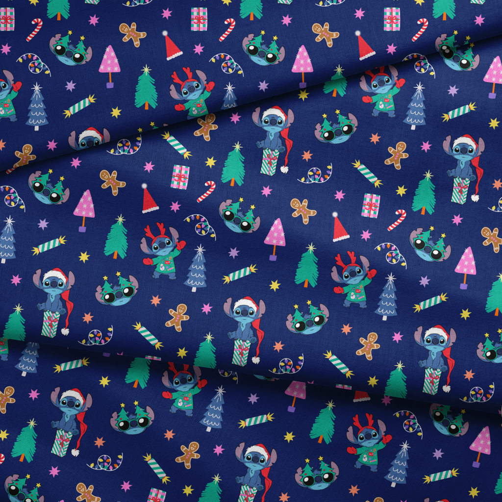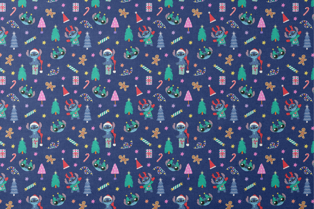 Festive Disney Stitch Christmas pattern with gingerbread men, candy canes, presents, and holiday trees on a deep blue background. Perfect for fans of this beloved animated character.