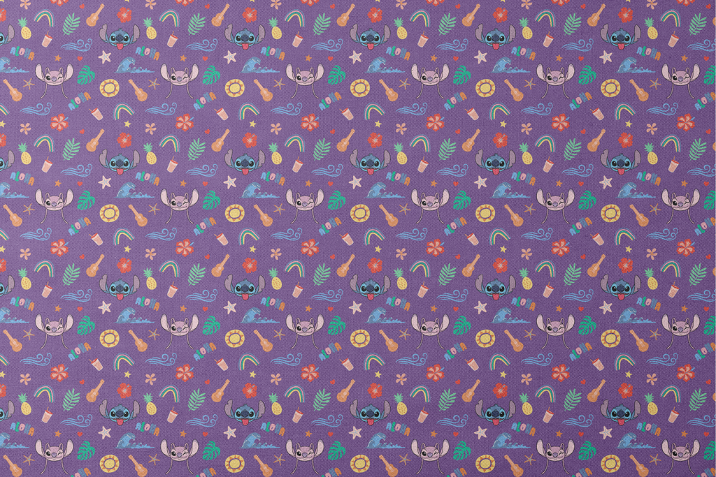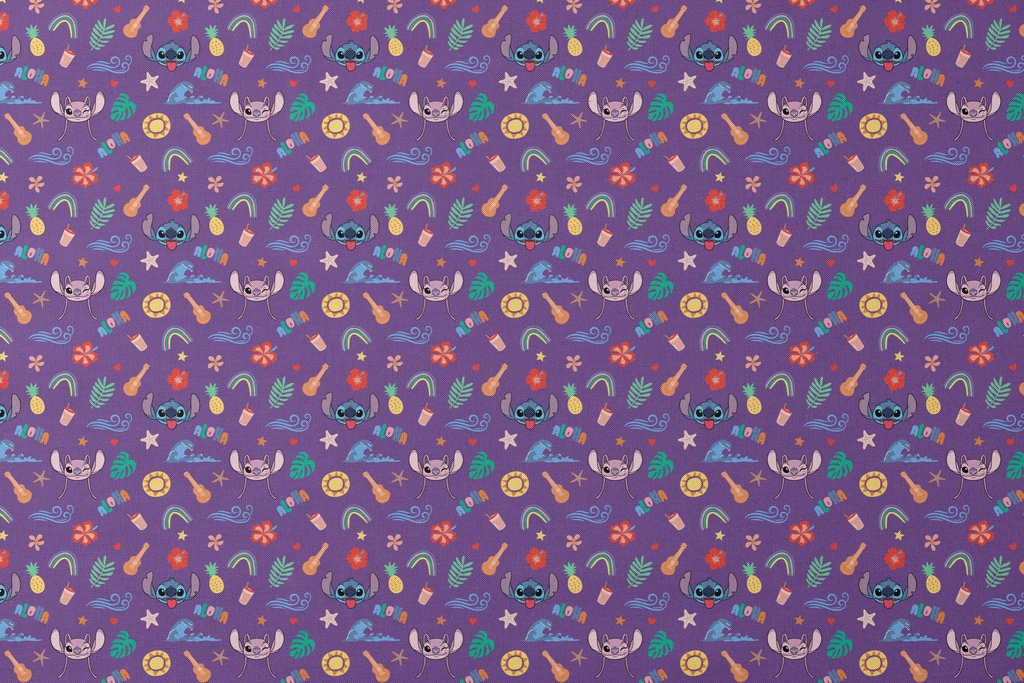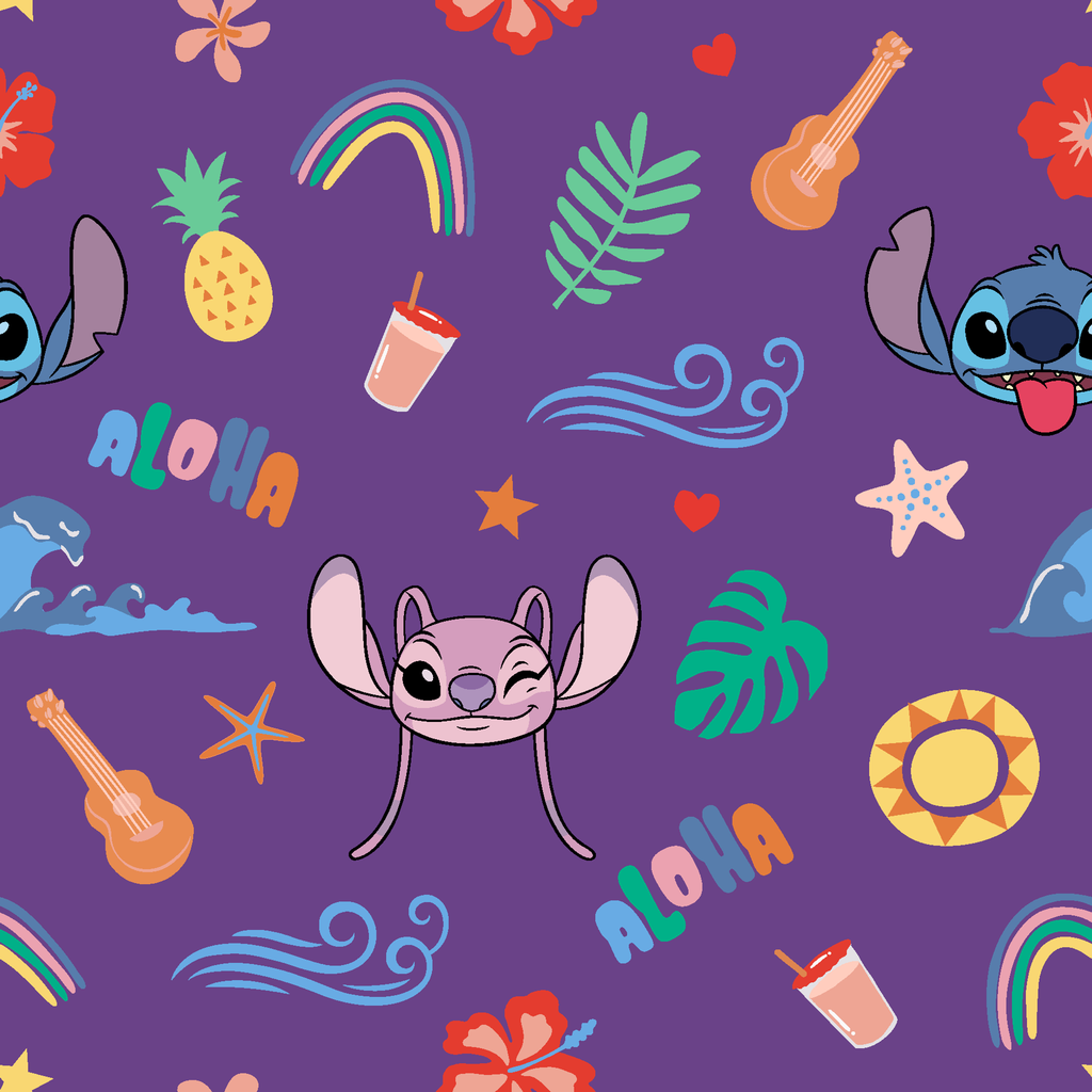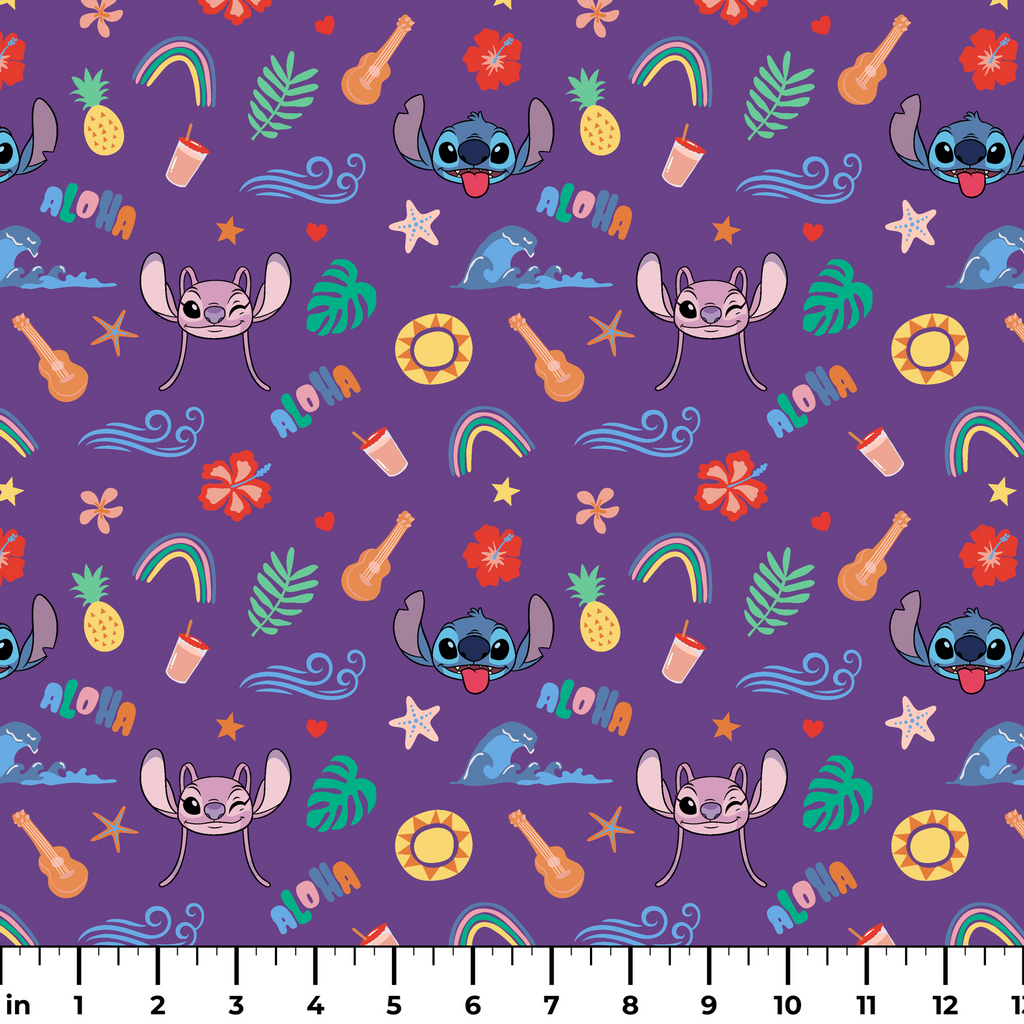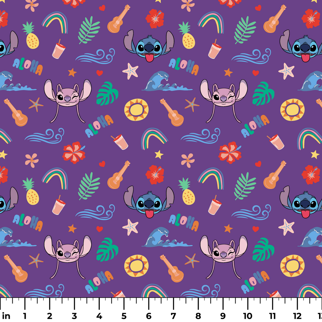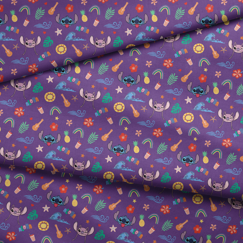 Vibrant purple fabric featuring a playful tropical paradise with beloved Disney's Stitch characters scattered among colorful Hawaiian motifs. Bright illustrations of ukuleles, pineapples, palm leaves, rainbows, and "Aloha" text create a cheerful summer vibe throughout the design. This whimsical cotton would make adorable children's clothing or the perfect fabric for beach bags and tropical-themed quilting projects.