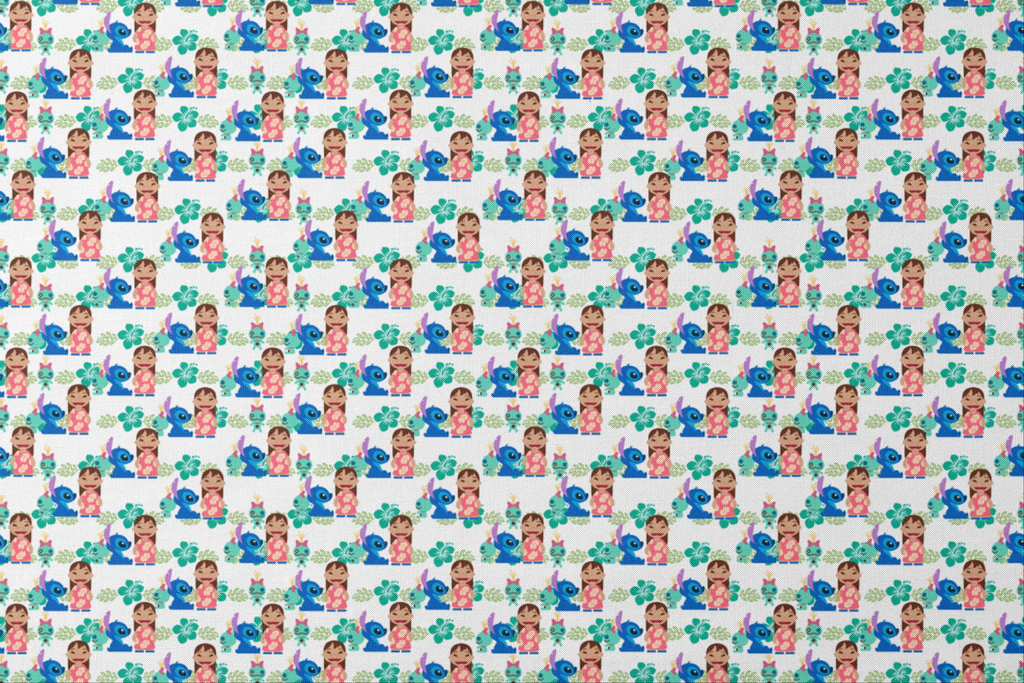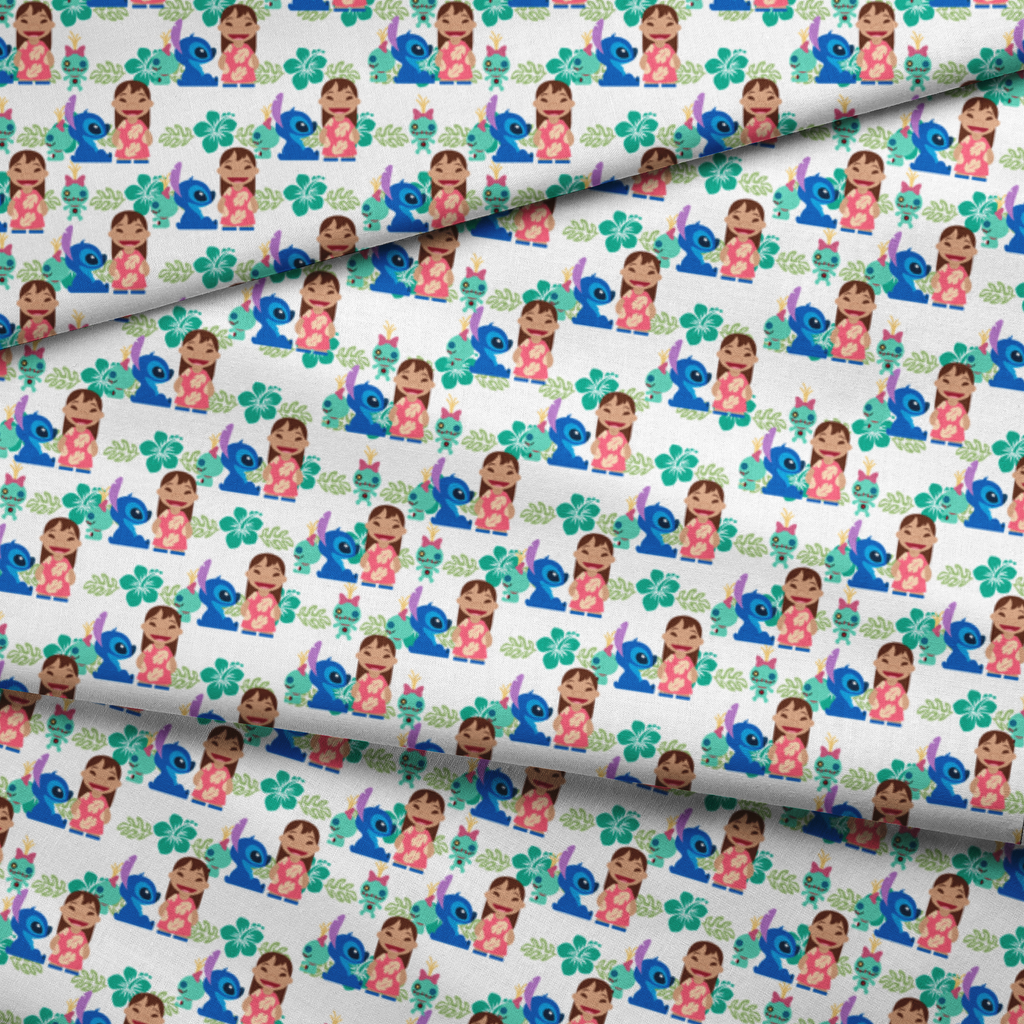 A crisp white background sets the stage for bold pops of teal hibiscus, tropical leaves, and beloved characters from Disney's Lilo & Stitch. The repeating pattern of Lilo, Stitch, and Scrump in full-color charm makes this design perfect for character apparel or playful home décor accents. The design has a friendly, upbeat energy with a classic island feel.