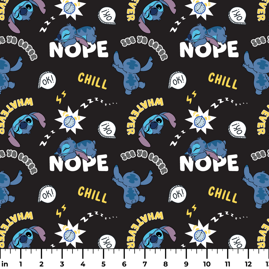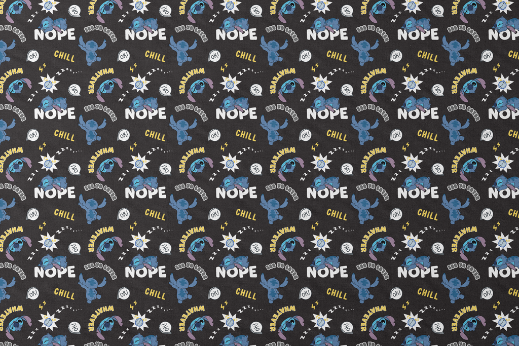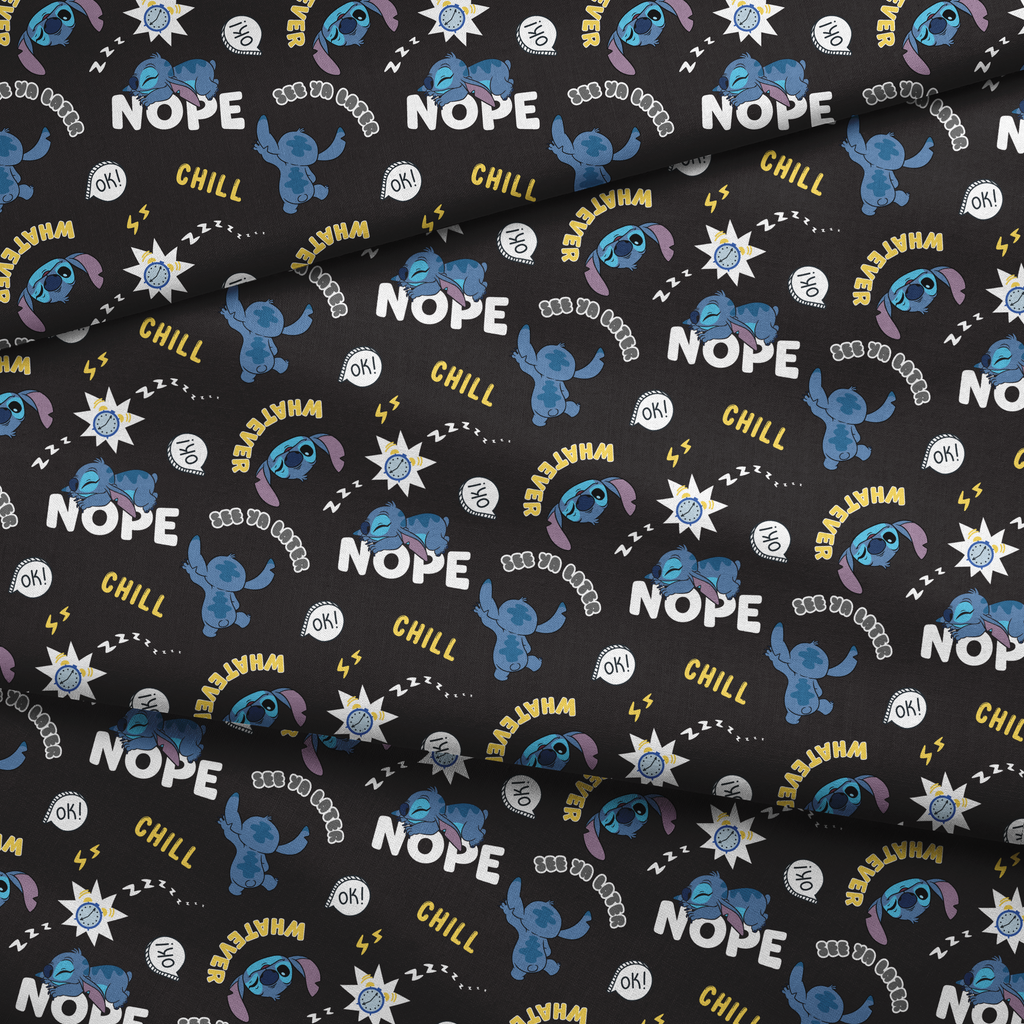 This playful Stitch character pattern features a black background with various expressions and moods like "NOPE" and "CHILL" - perfect for Disney fans who love this mischievous blue alien.