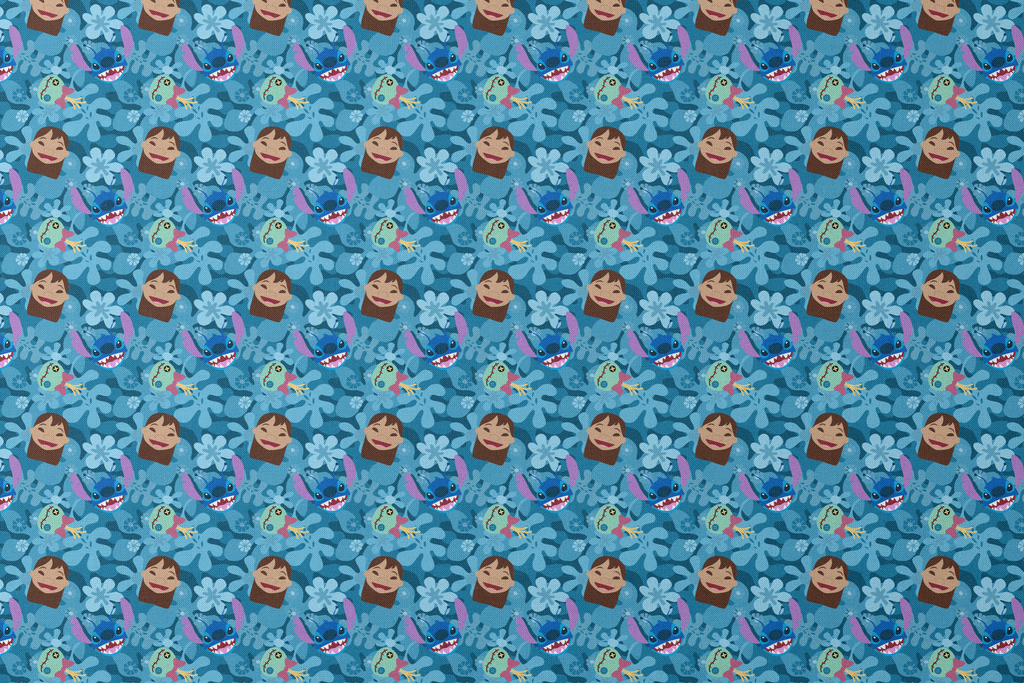 Dive into the adorable world of Lilo and Stitch with this playful blue pattern featuring the mischievous alien and tropical flowers in a cheerful cartoon style.