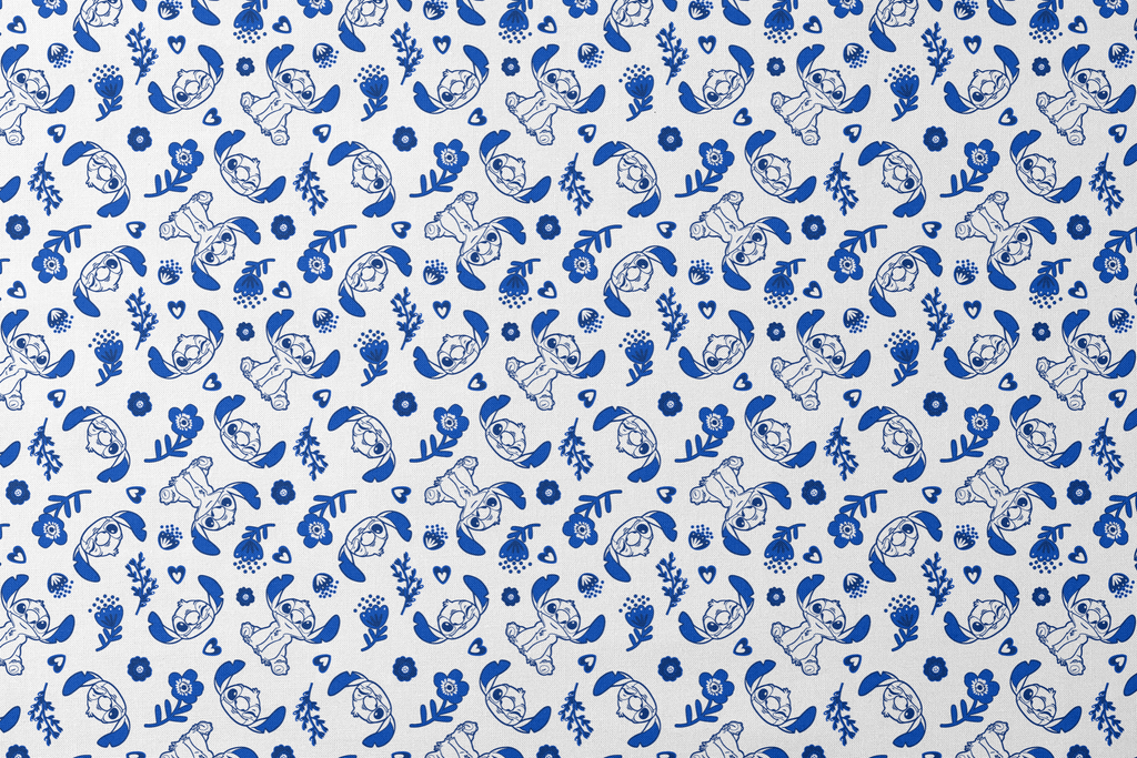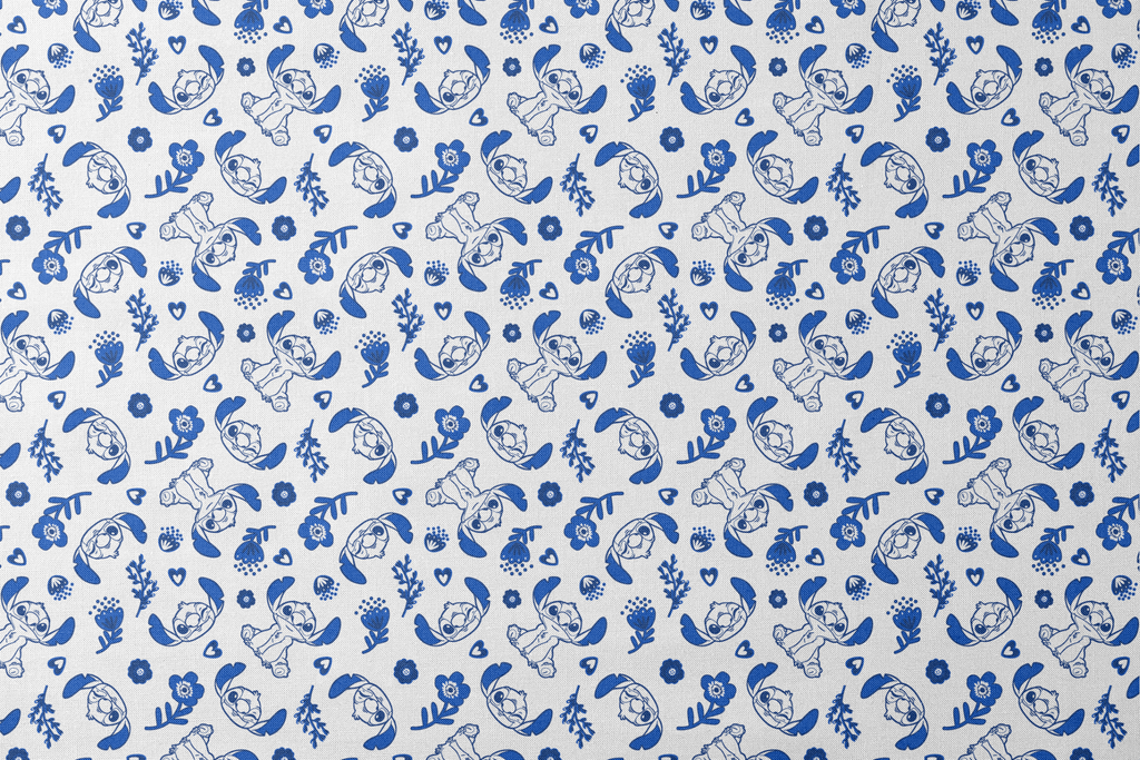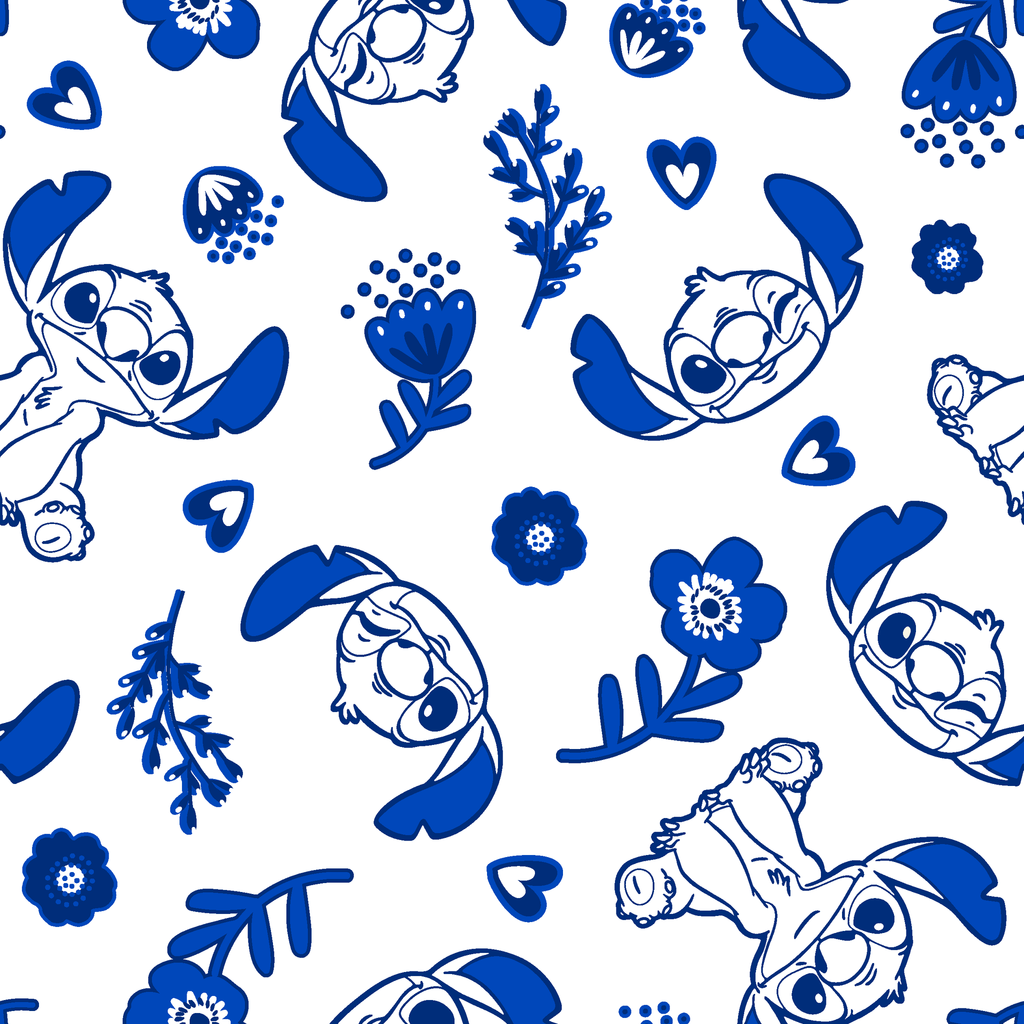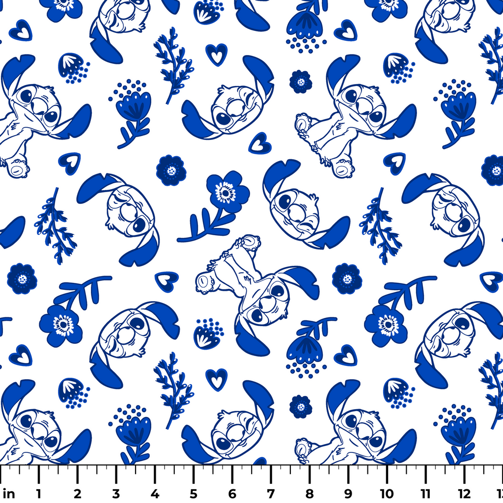 This charming fabric features Disney's Stitch from Lilo & Stitch in a playful blue and white design. The beloved character appears in various poses against a crisp white background, surrounded by stylized blue florals, hearts, and foliage that create a delightful botanical motif. Perfect for creating children's apparel, decorative pillows, or a special quilt that will bring Disney magic into any space.