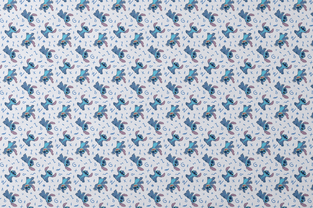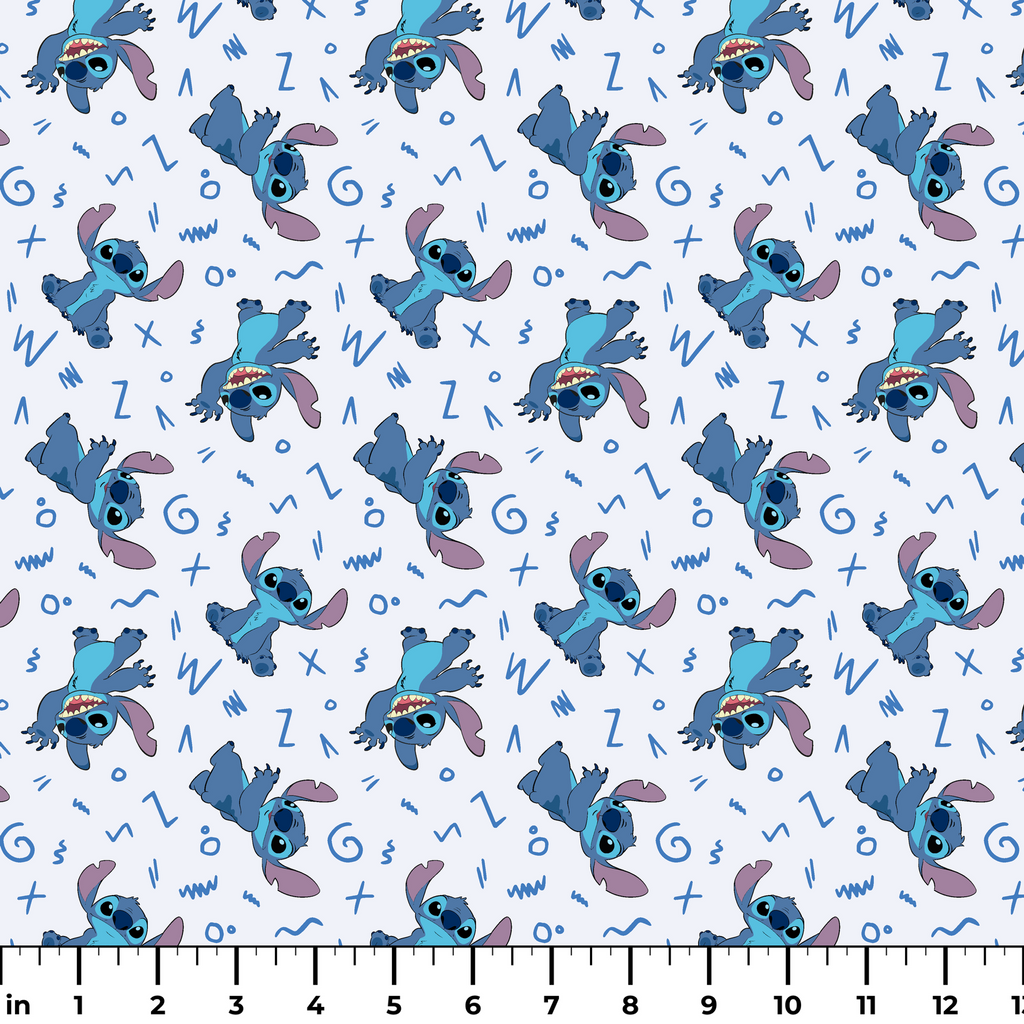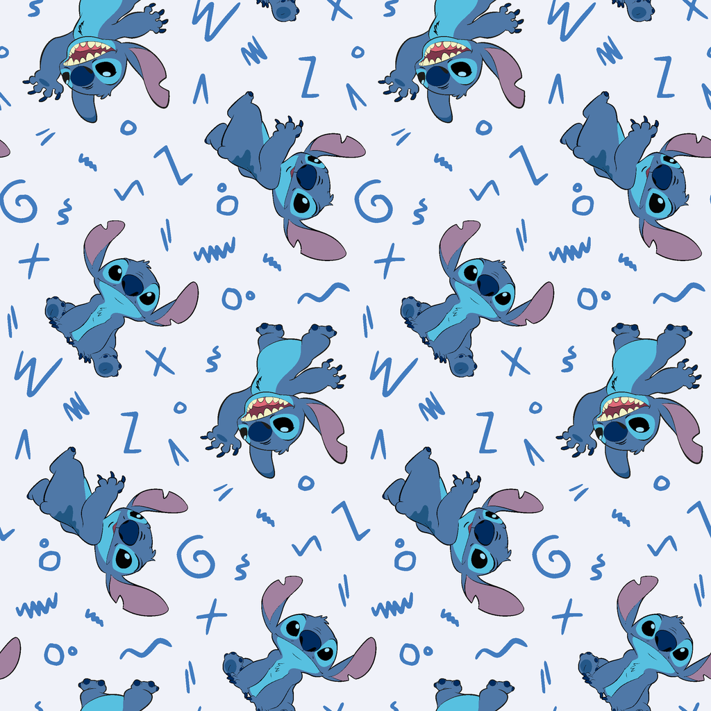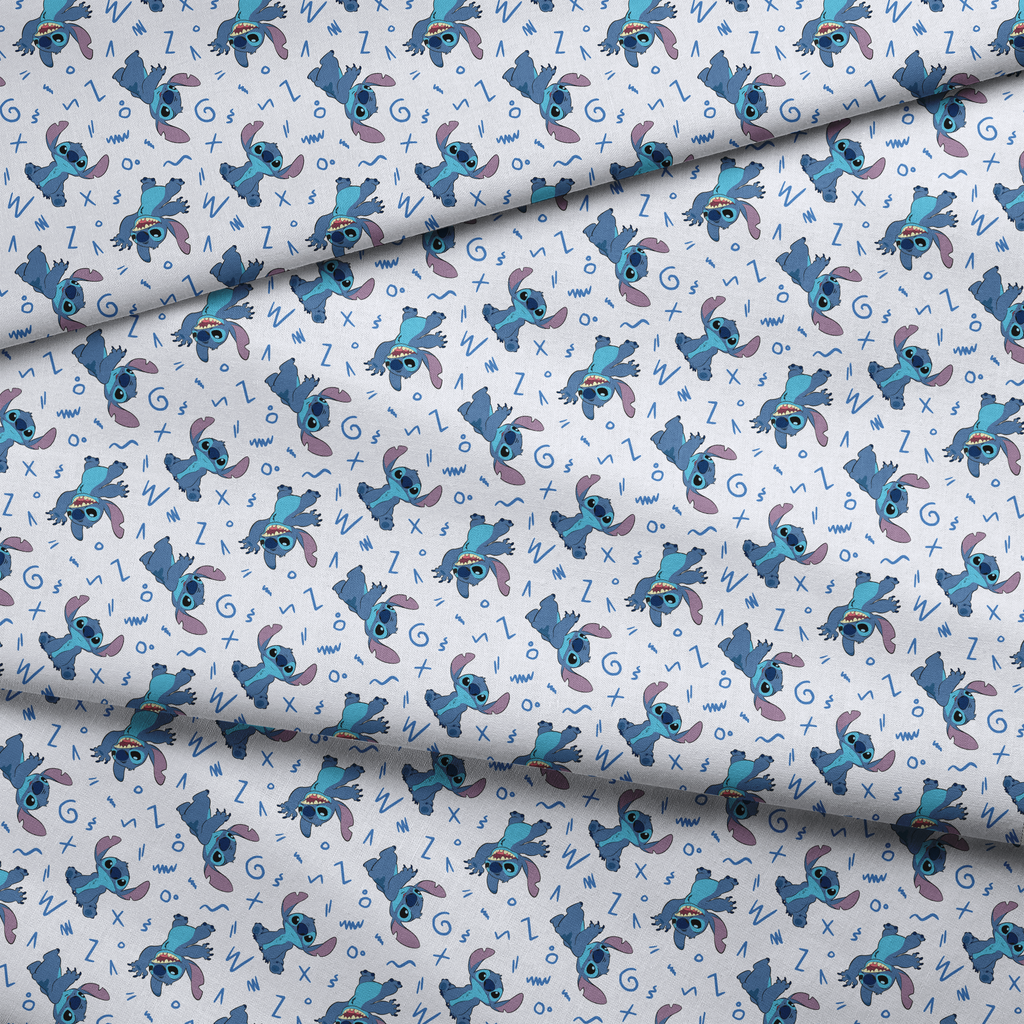 This playful pattern features the mischievous Disney's Stitch character from Lilo & Stitch scattered across a crisp white background. Different poses of the blue alien with his signature purple ears and toothy grin are interspersed with fun doodles and squiggles in various shades of blue. Perfect for creating pajamas for little ones or a quirky cushion cover for Disney fans of any age, this fabric brings a touch of extraterrestrial charm to any sewing project.