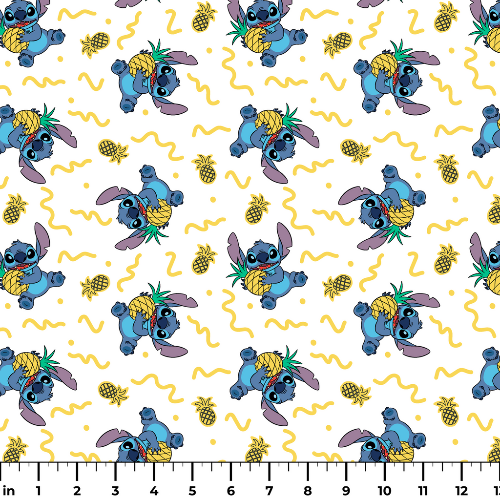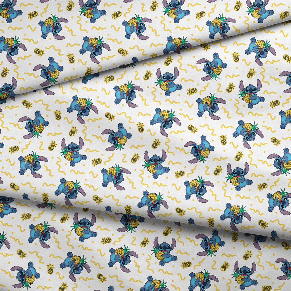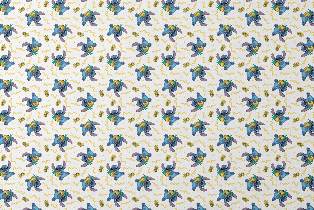 This vibrant pattern features a Disney's Stitch holding pineapples on a white background with yellow squiggly lines. Perfect for fans of tropical Hawaiian themes and animated character designs.