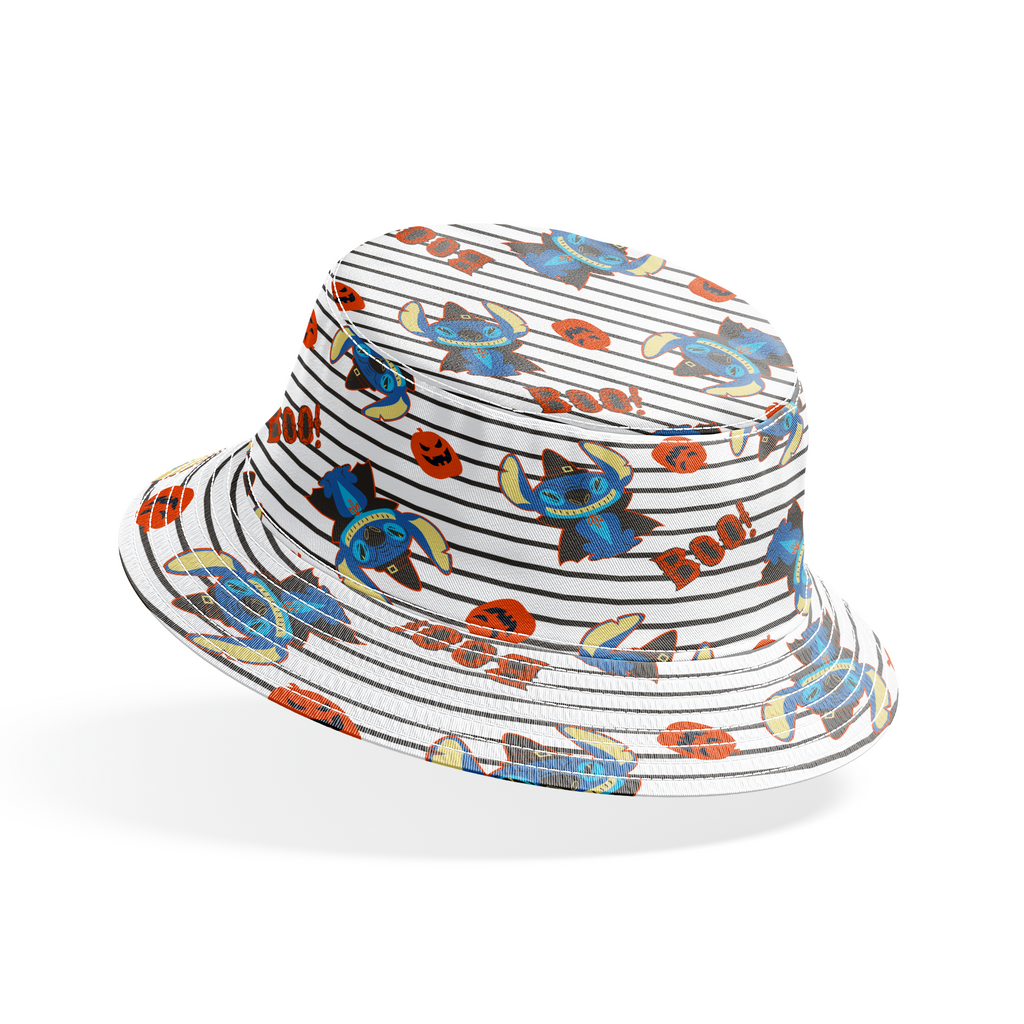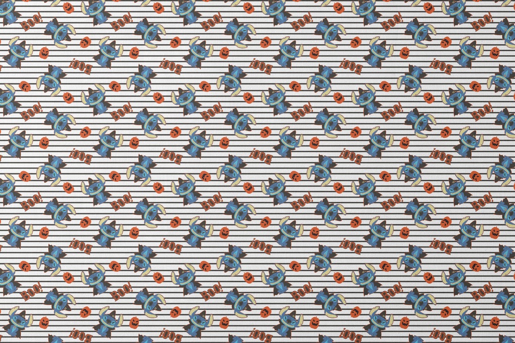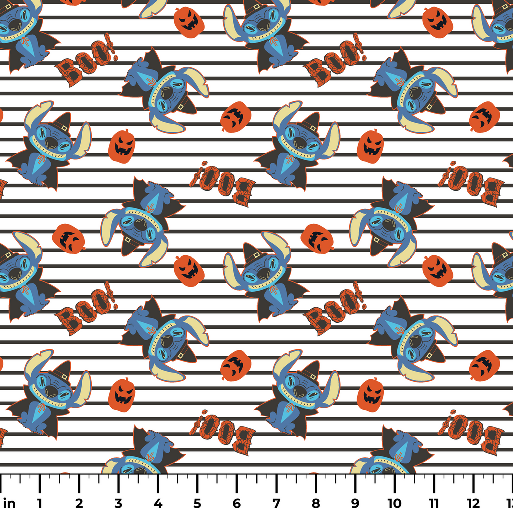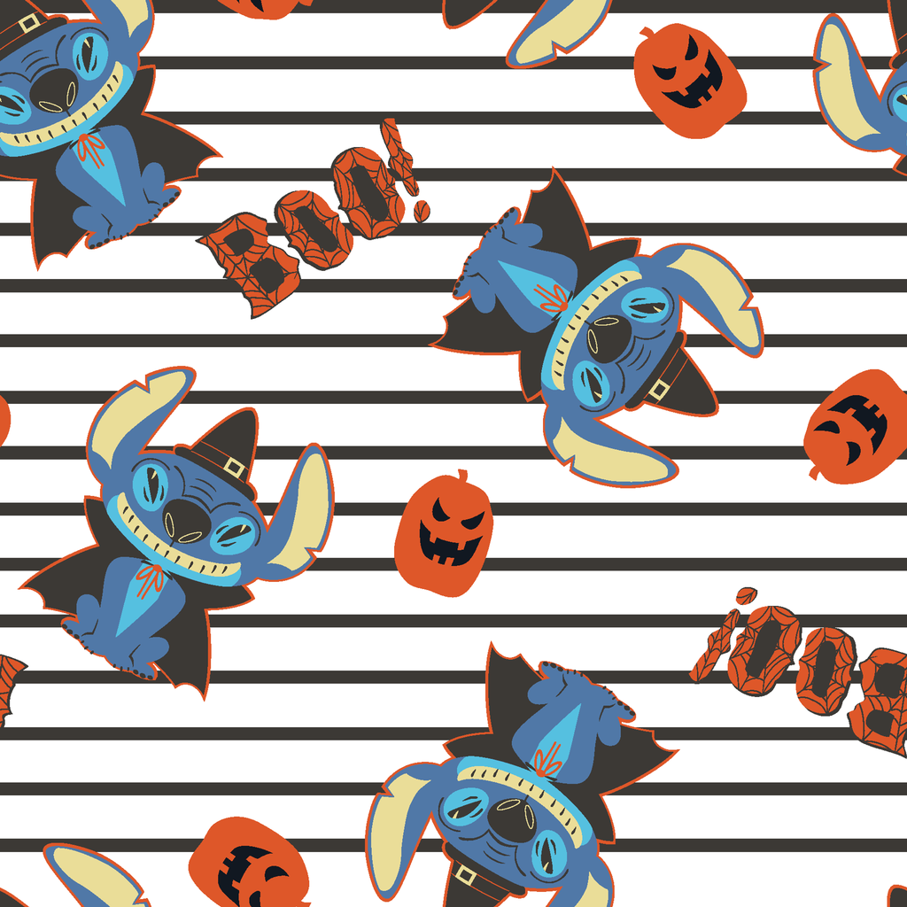 Playful Halloween pattern featuring Disney's Stitch and orange jack-o'-lanterns on a black and white striped background. Perfect for spooky season decor or themed apparel.