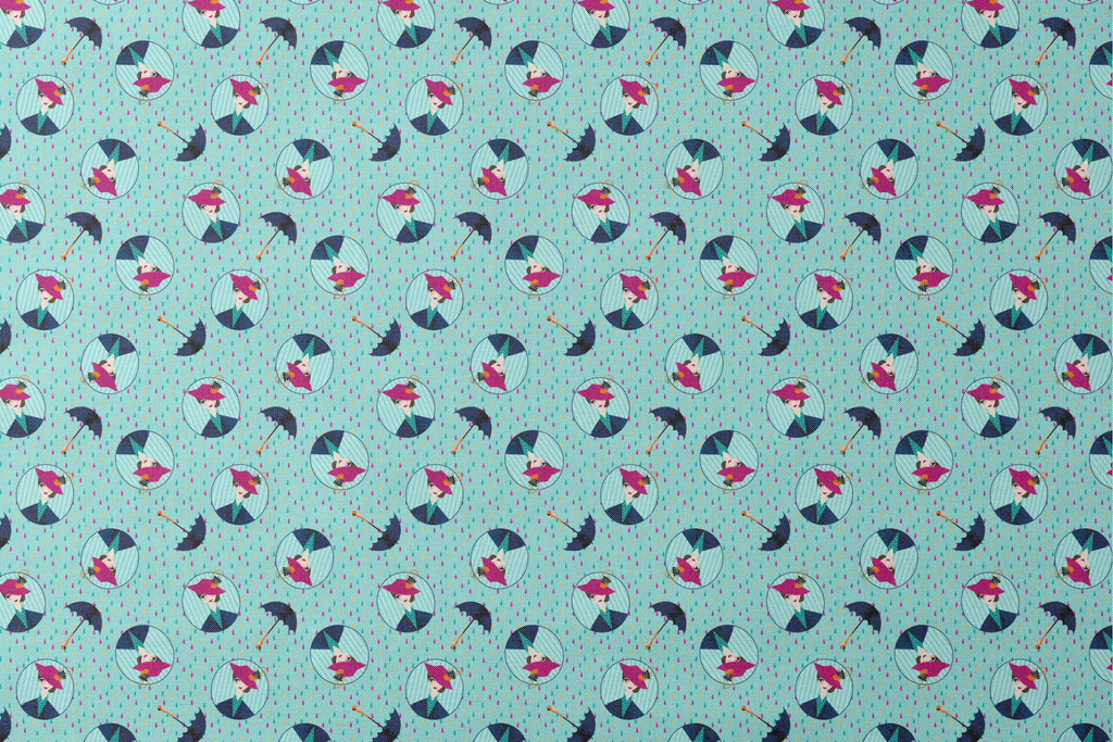 Playful umbrella pattern featuring colorful rain drops on a turquoise background with Disney's Mary Poppins in circular frames, perfect for modern home decor or children's apparel.