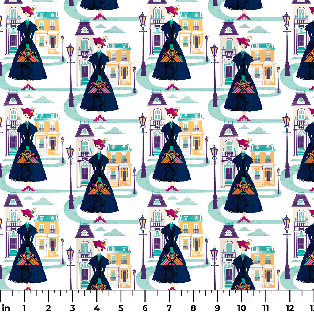 Enchanting pattern featuring Disney's Mary Poppins in a navy dress with colorful geometric accents, set against a charming cityscape with purple houses and vintage lampposts.