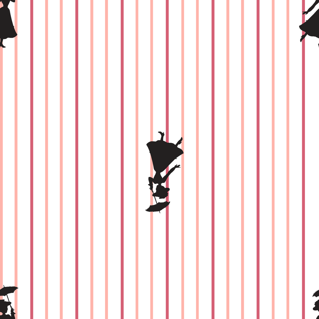 Chic Disney's Mary Poppins silhouettes on soft pink striped background create a stylish contemporary pattern perfect for home decor, apparel, or accessories.