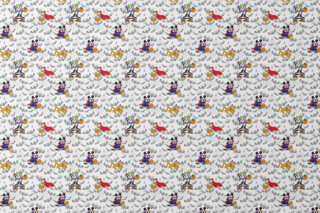 Spooky Halloween fabric featuring Disney Mickey Mouse & friends dressed in costumes with jack-o-lanterns, set against a background of grey bats and spiderwebs.