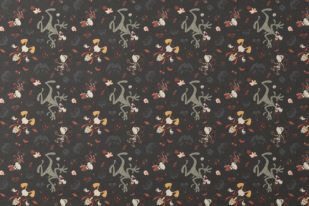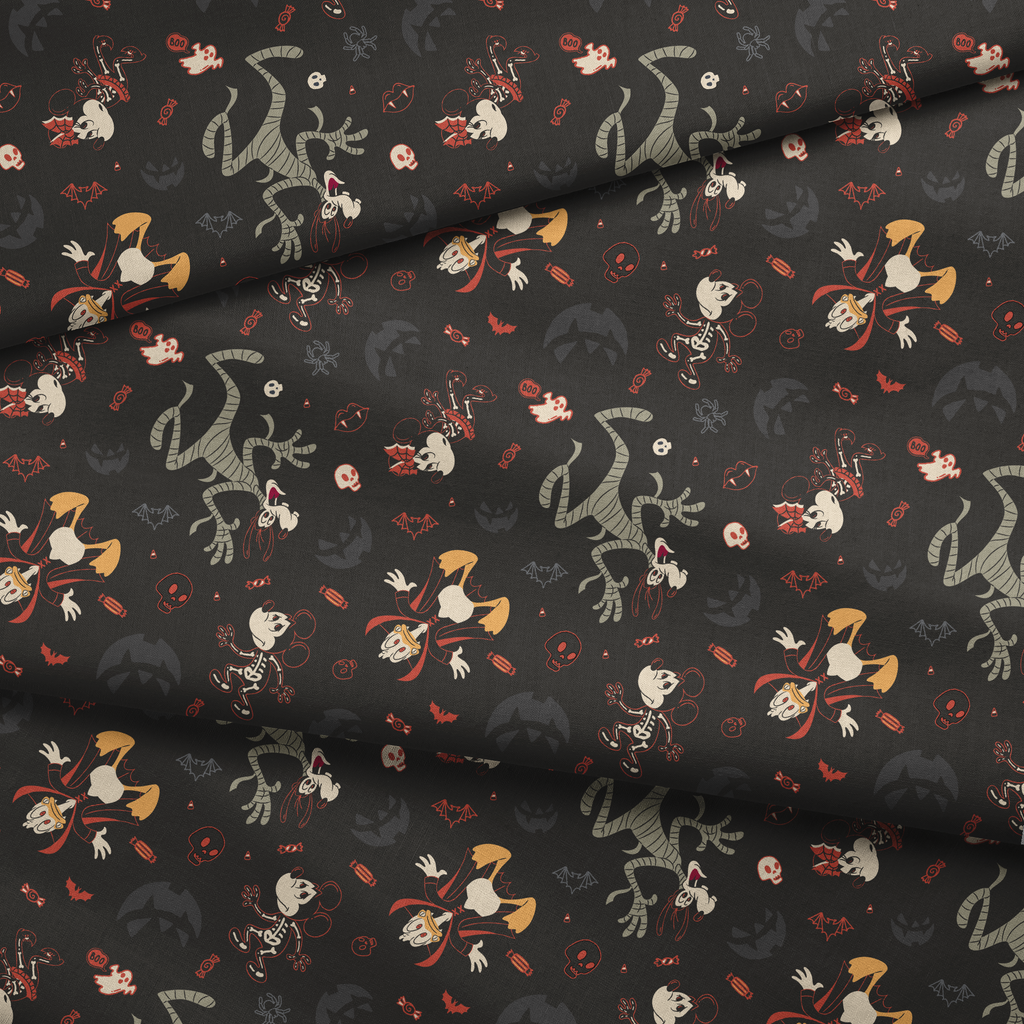 A spooky Disney Halloween pattern featuring Mickey & friends in costumes on a black background—perfect for Halloween decor or gothic-inspired apparel.