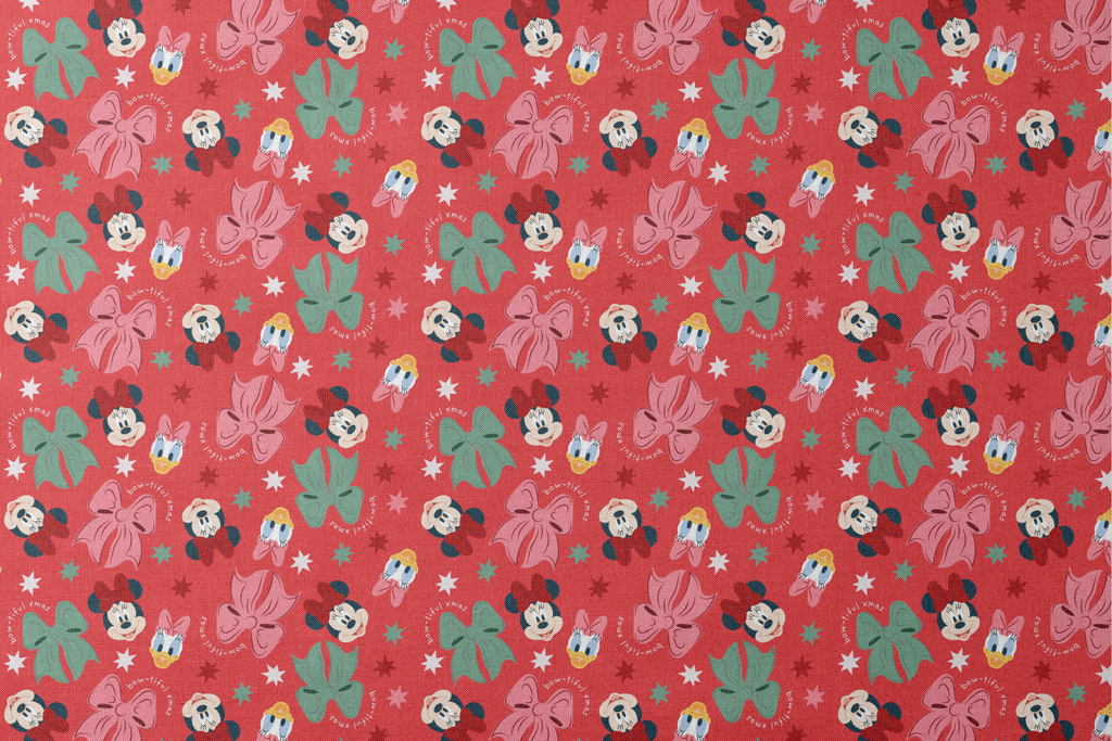 Festive Disney Christmas pattern featuring Disney Minnie Mouse and Daisy Duck with bows and stars on a vibrant red background, perfect for holiday crafting.