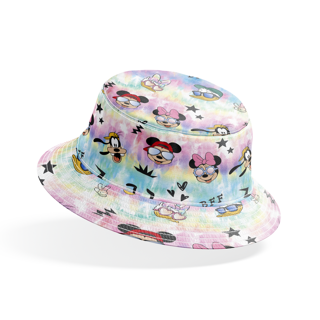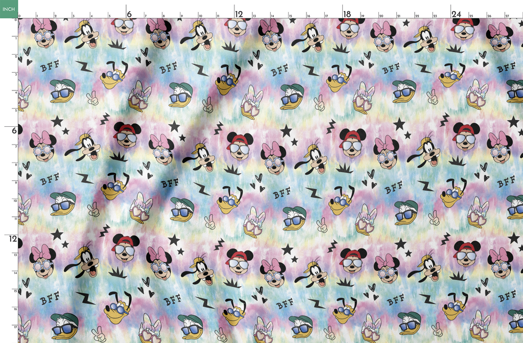 Colorful tie-dye toss featuring Disney Mickey & Friends characters with sunglasses and "BFF" text. Perfect for fans of this iconic group of friends.