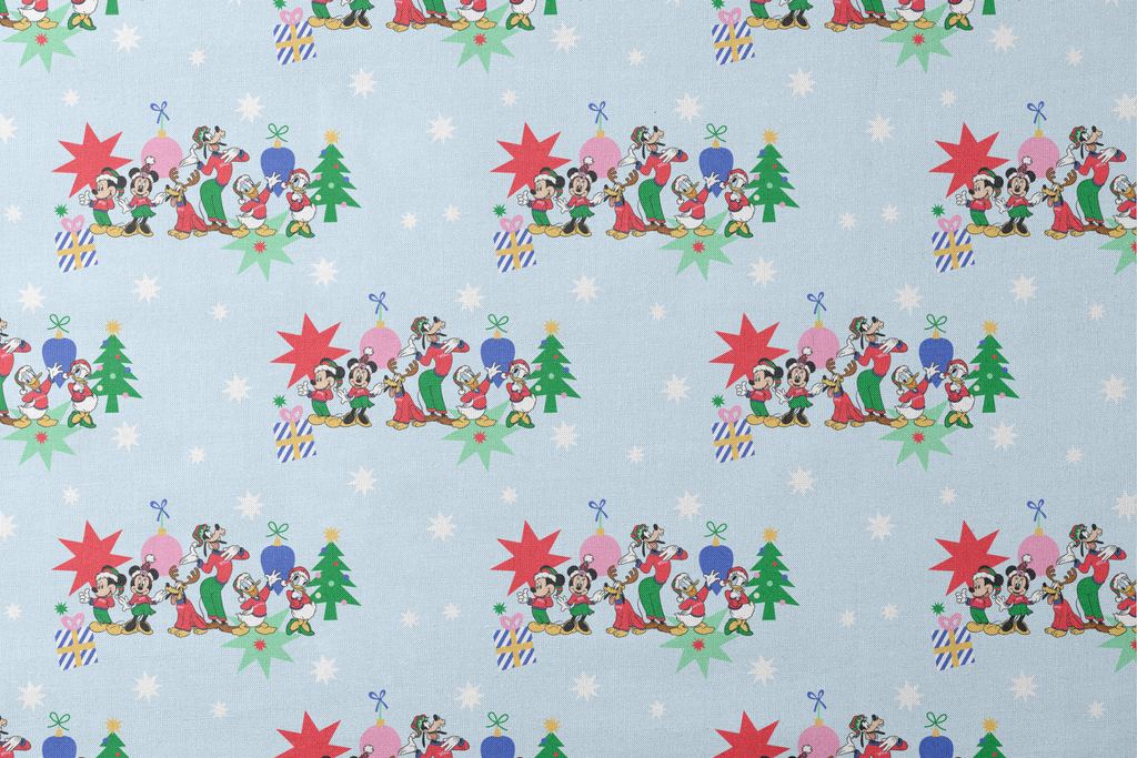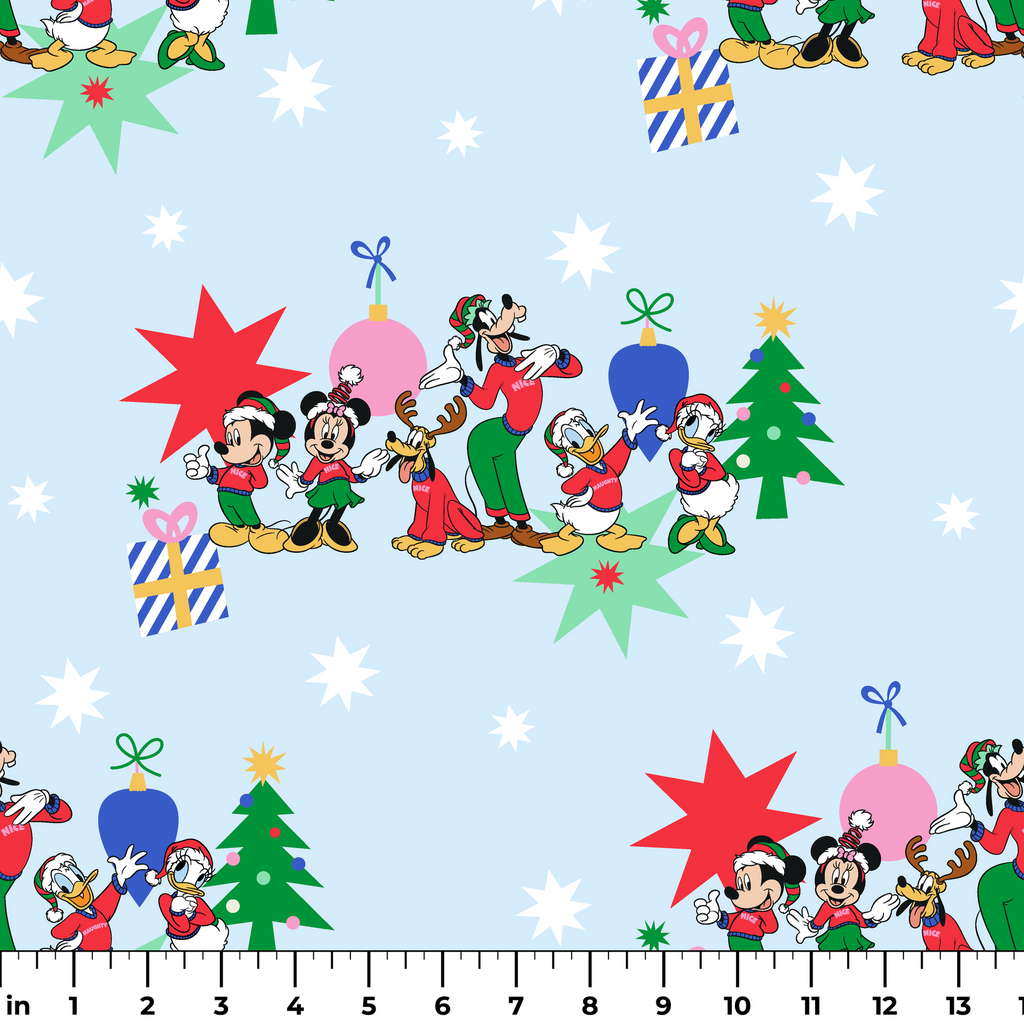 Festive Disney Christmas fabric featuring Mickey Mouse and friends surrounded by holiday gifts, bright red stars, colorful ornaments, and Christmas trees on a light blue snowy background.