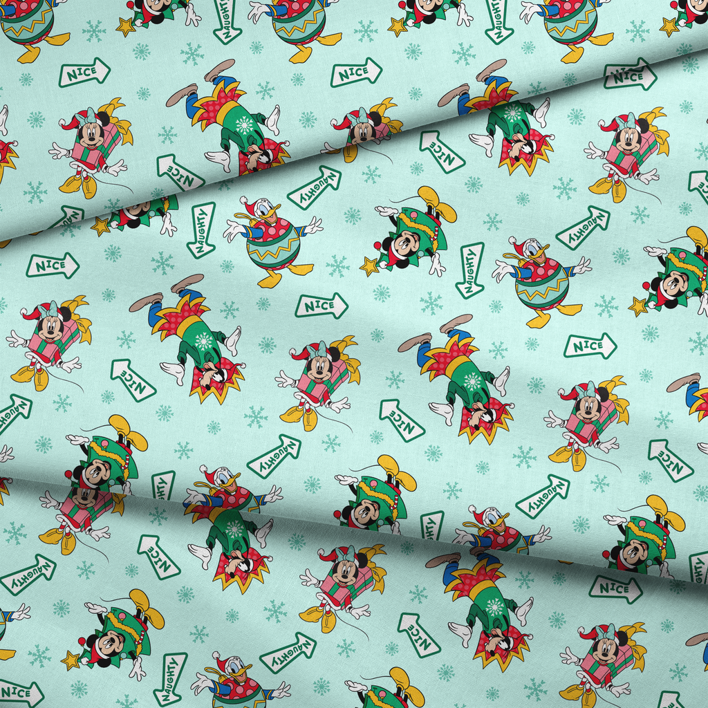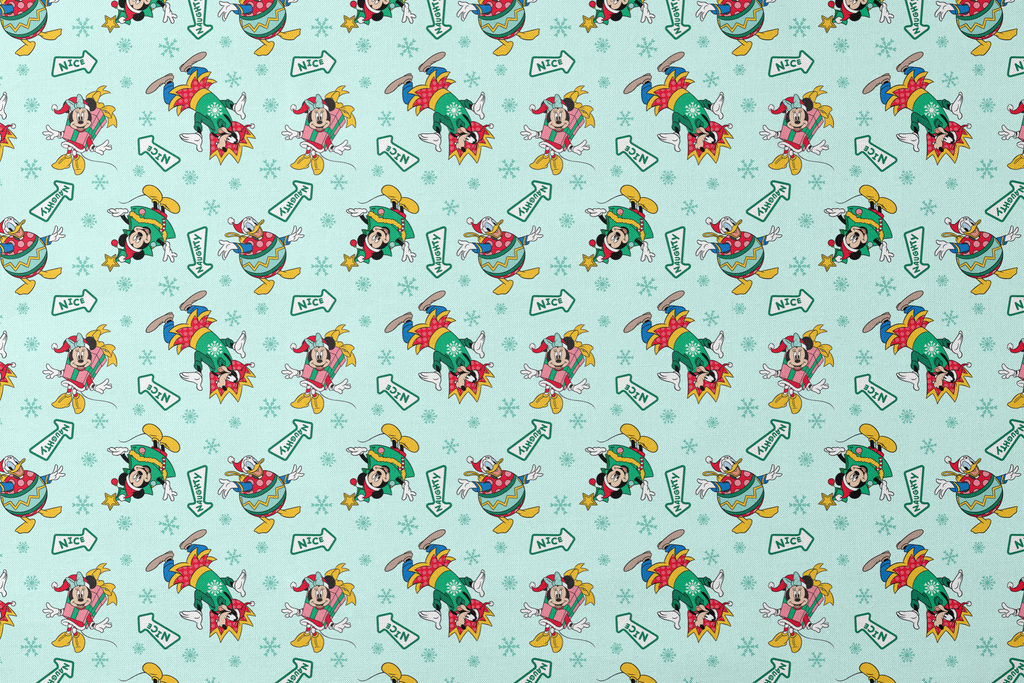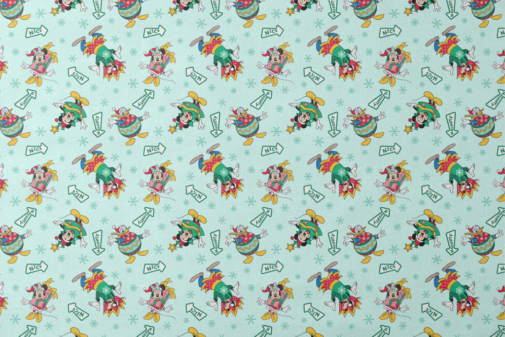 Festive Disney character holiday pattern featuring Mickey and friends in colorful winter outfits, with snowflakes and "Nice" arrows on a mint green background.