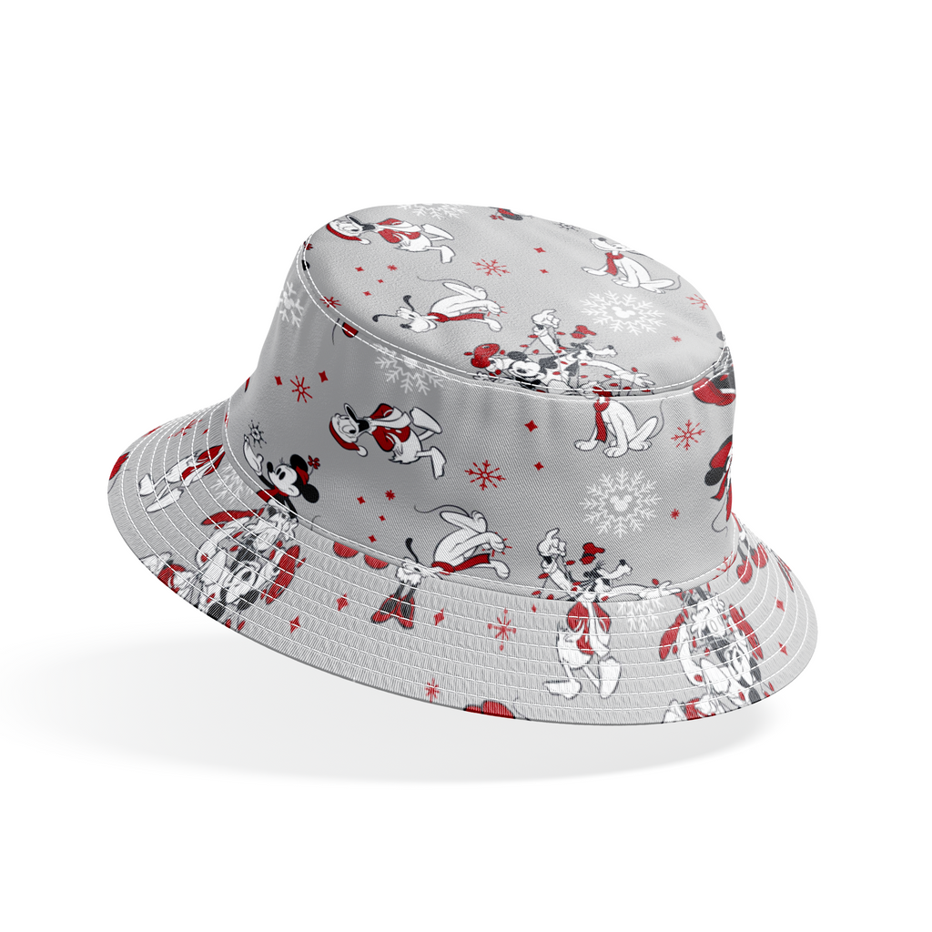 Festive Disney Mickey Mouse and Minnie Mouse winter pattern featuring classic Disney characters in red and white holiday attire, surrounded by delicate snowflakes on a stylish gray background.