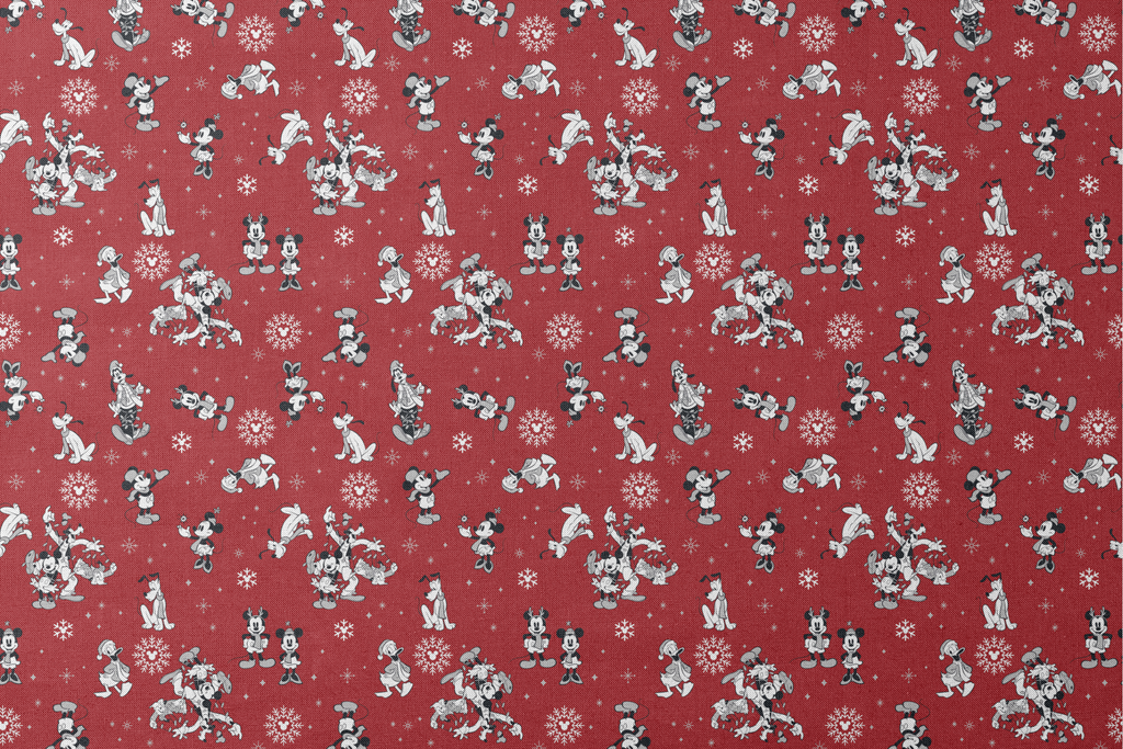 Festive Disney Mickey Mouse & Minnie Mouse pattern on a red winter background with snowflakes. Perfect for holiday crafting, quilting, and seasonal decor projects.