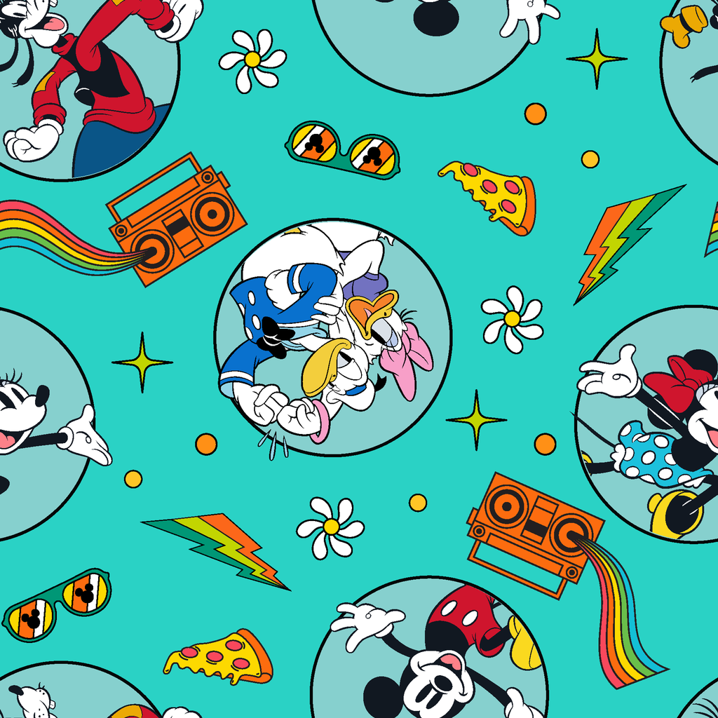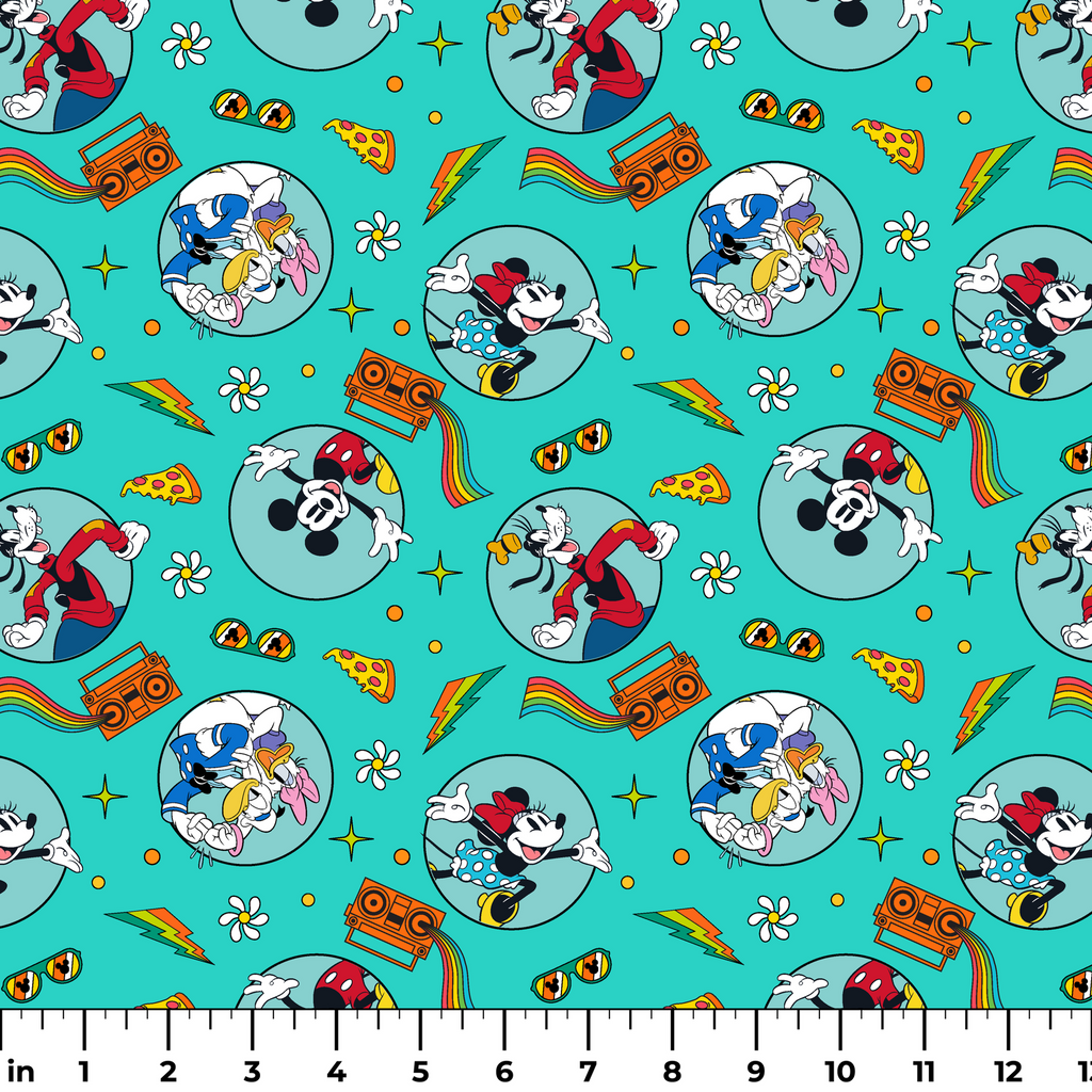 This vibrant Disney Mickey Mouse and friends fabric features retro Disney characters with fun 90s elements like boomboxes, pizza, and sunglasses on a bright turquoise background.