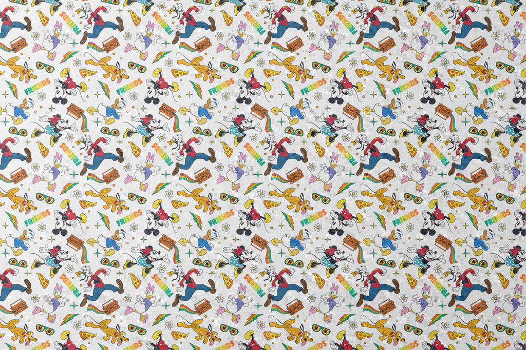Colorful retro pattern featuring classic Disney characters Mickey Mouse, Donald Duck, and Daisy Duck with vibrant "Friends" text, sunglasses, and nostalgic 90s elements on a white background.