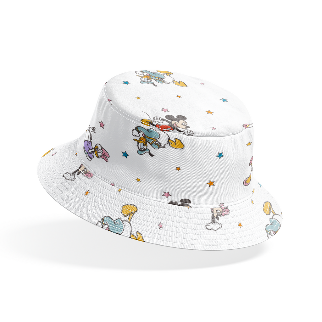 Whimsical Disney Mickey Mouse pattern featuring classic Disney characters in playful poses against a white background with colorful stars, perfect for children's decor or apparel.