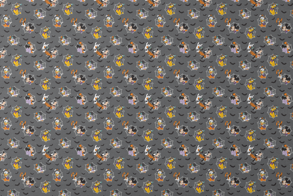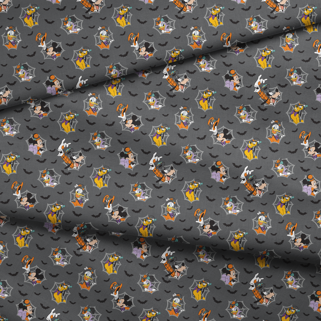 Spooky Halloween fabric featuring Disney characters in spider webs with bats on a gray background - perfect for seasonal sewing projects and Halloween decor.