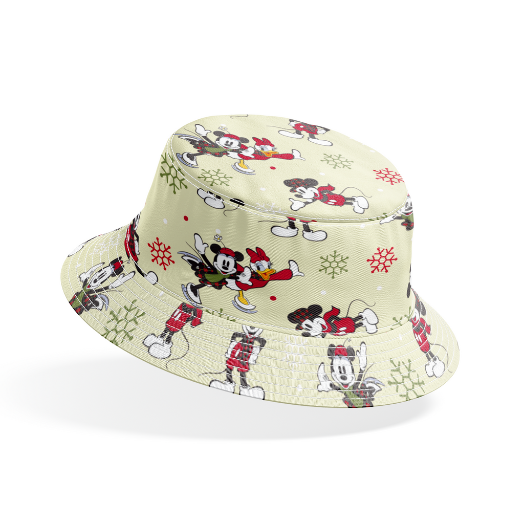 Festive Disney holiday pattern with classic cartoon characters in red and green outfits surrounded by snowflakes on a cream background. Perfect for Christmas decor or winter-themed projects.
