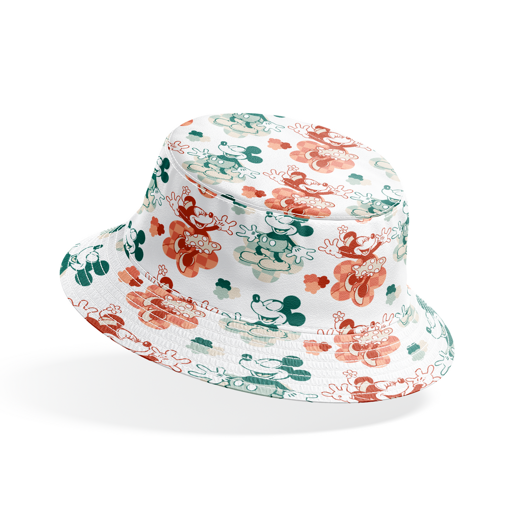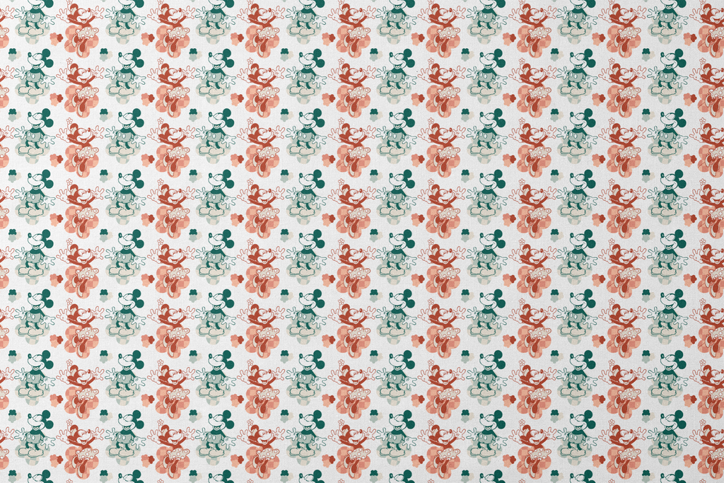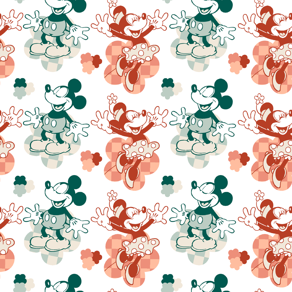 A vintage-style Disney Mickey Mouse design in a retro palette of green, peach, and rusty red. This officially licensed Disney artwork features classic character poses and whimsical details—perfect for nostalgic, animation-inspired projects. ©Disney
