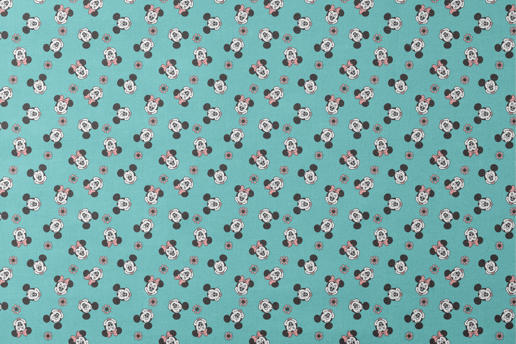 Adorable Disney-inspired pattern featuring Mickey Mouse and Minnie Mouse on a turquoise background with scattered daisies. Perfect for kids' apparel or home decor.