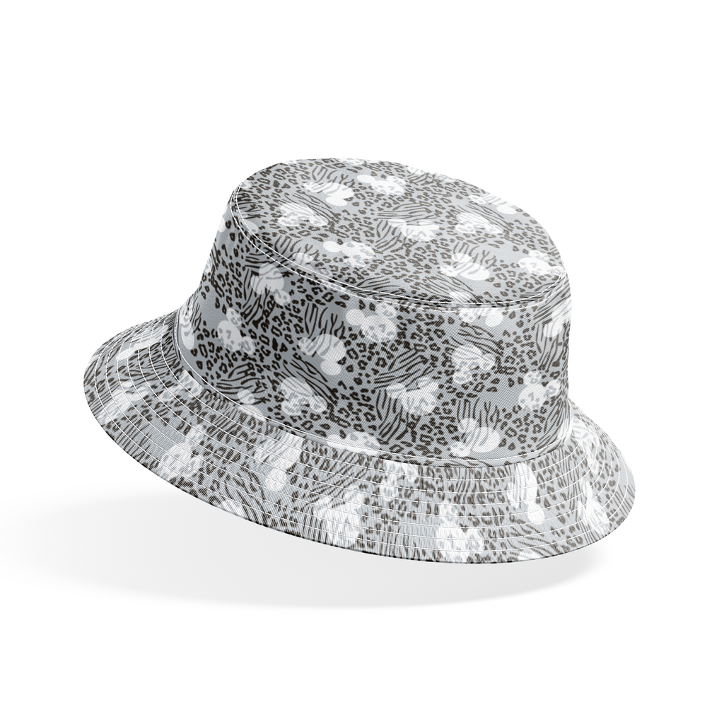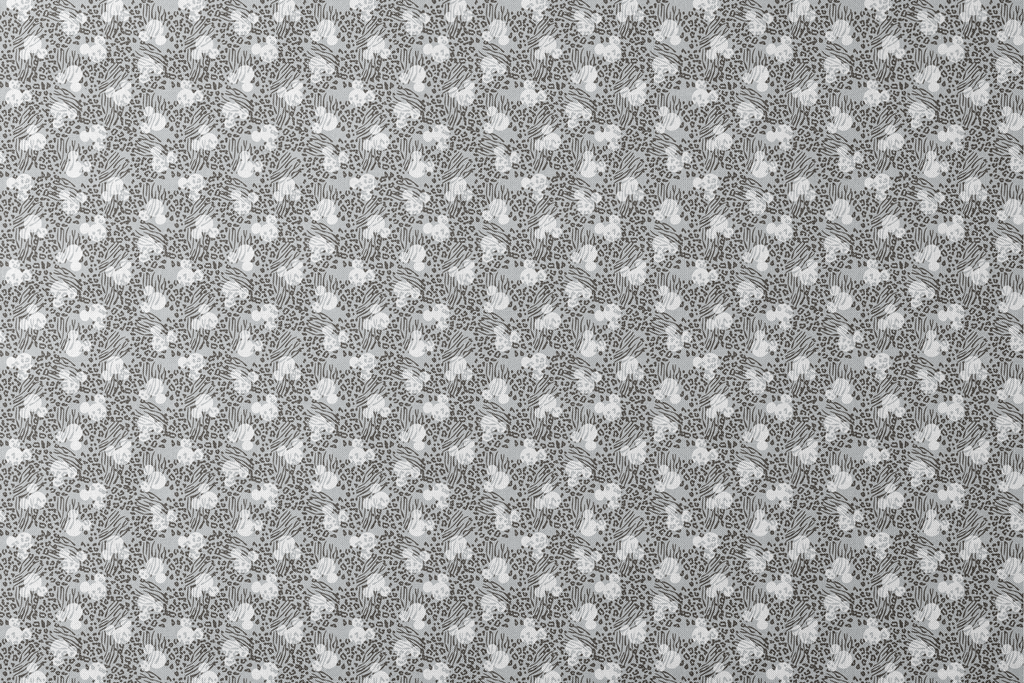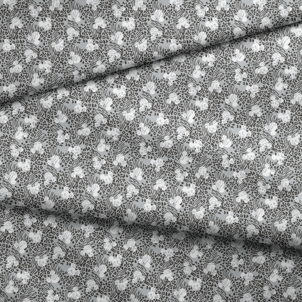Disney Mickey Mouse head silhouettes tossed among striking black and white animal print mix featuring abstract zebra stripes and leopard spots on a gray background – perfect for contemporary fashion and bold home decor.