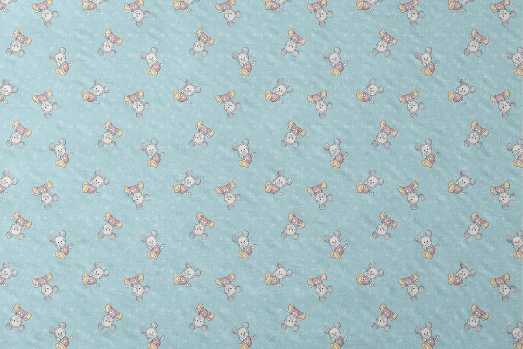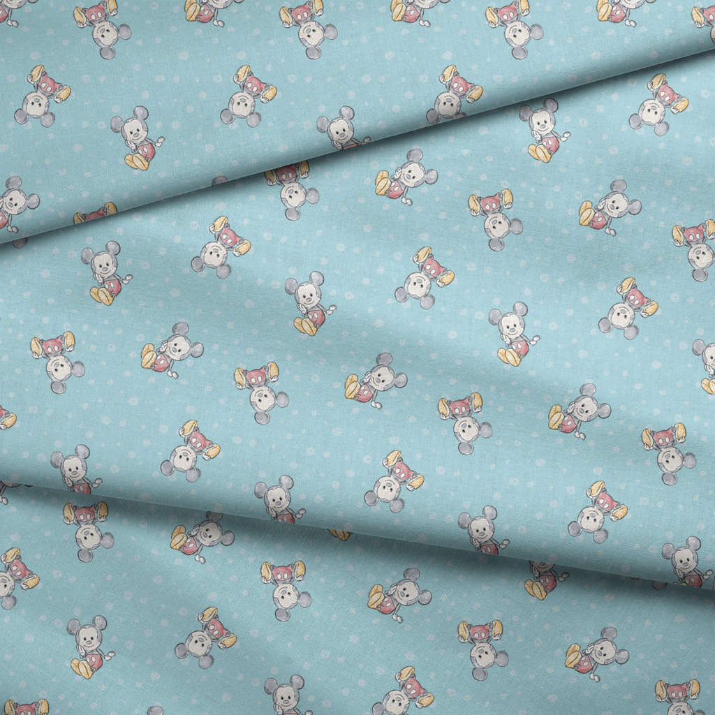 Adorable Disney Mickey Mouse pattern on soft blue background with polka dots. Sweet and whimsical design perfect for children's bedding, nursery décor, or baby apparel.