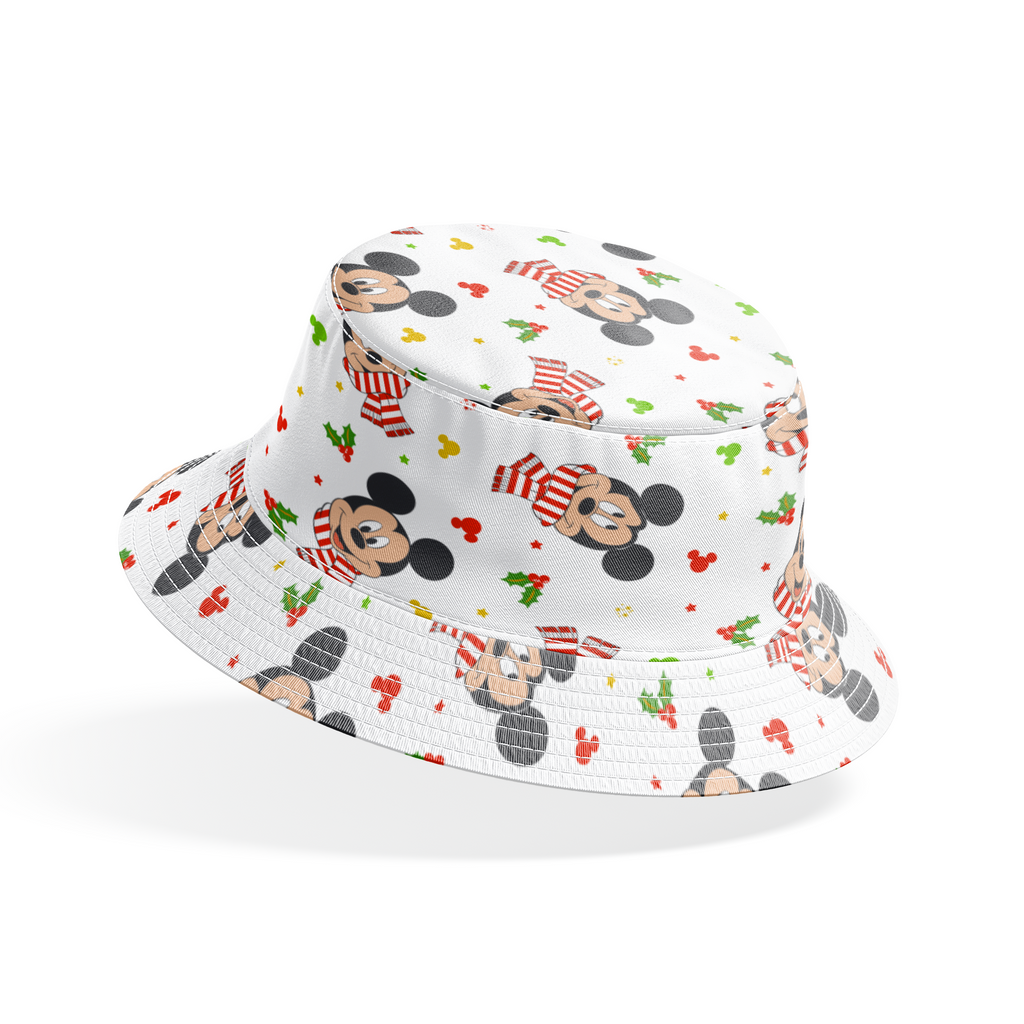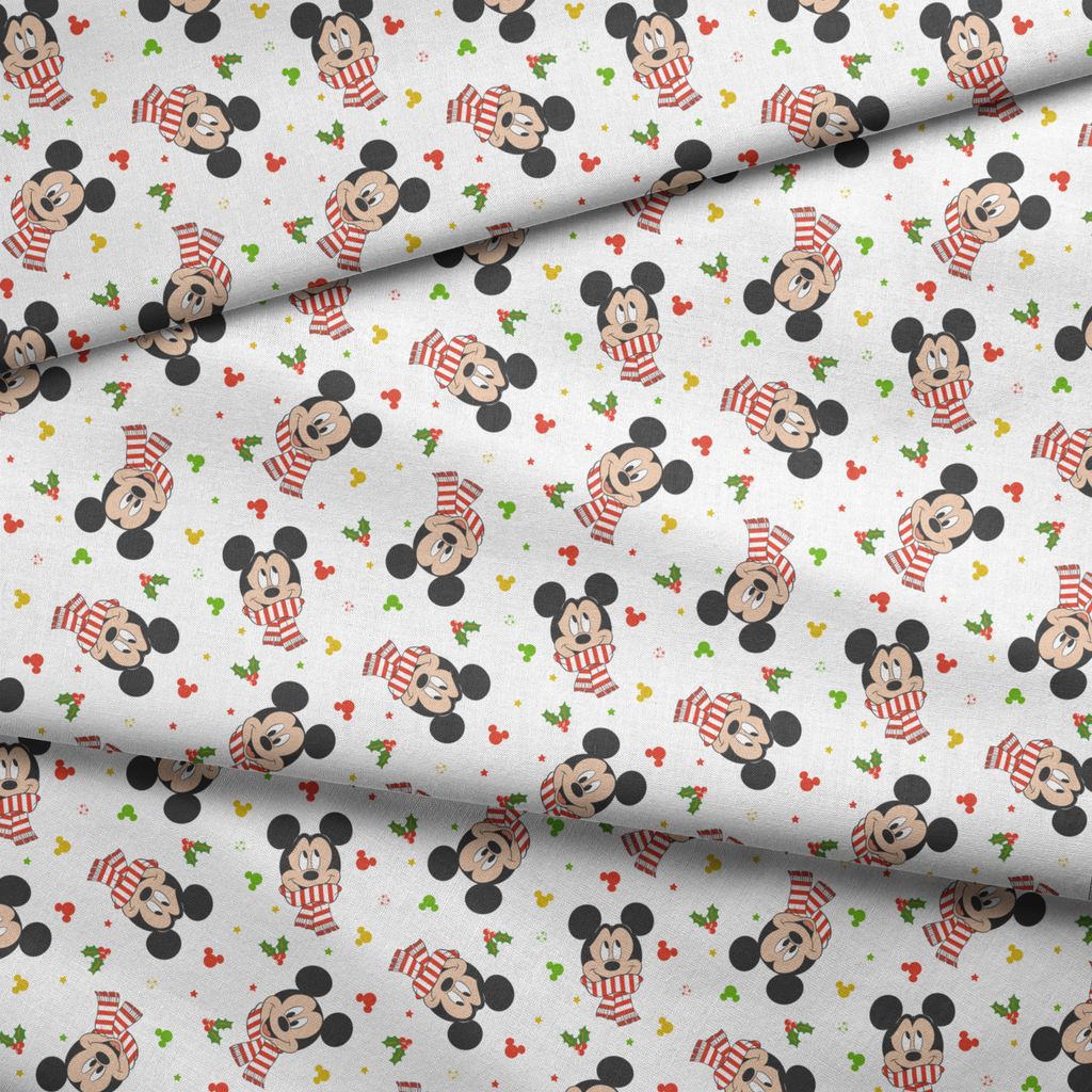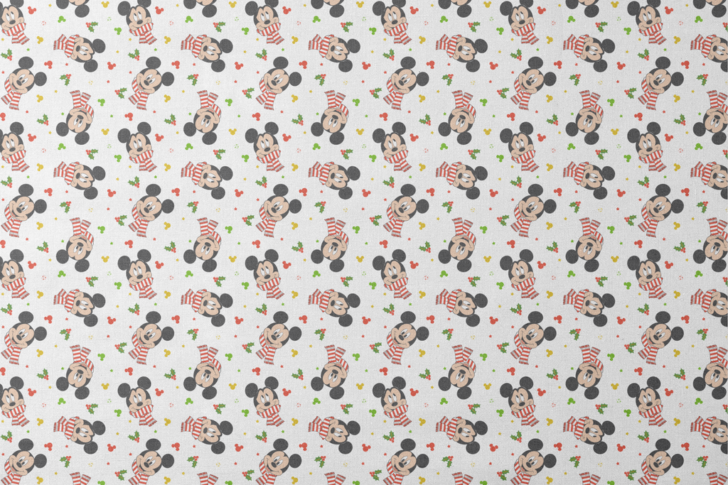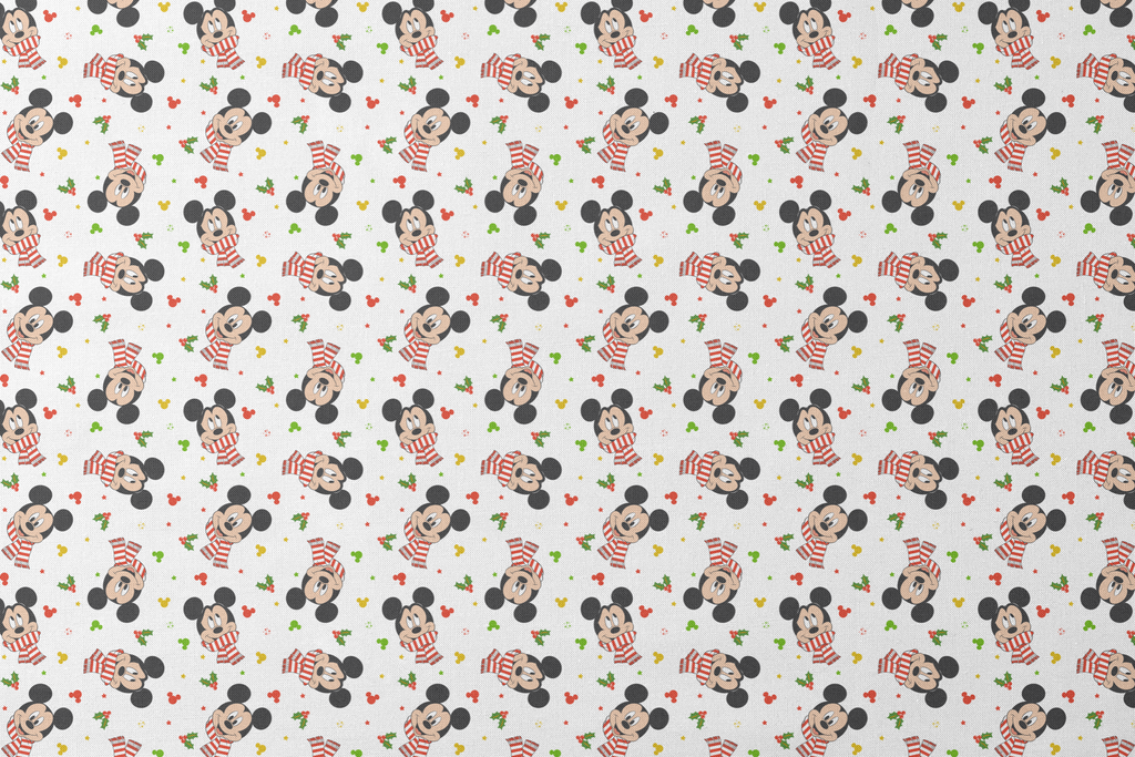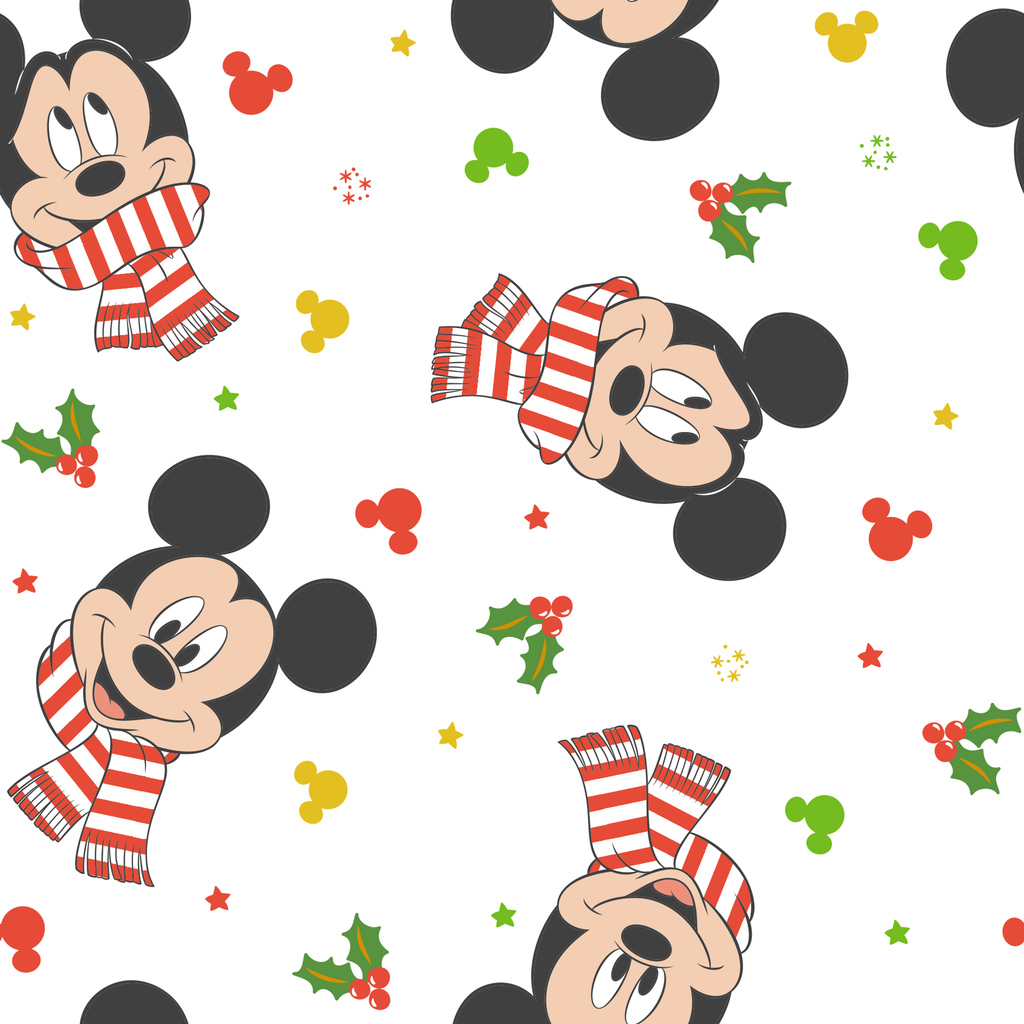 Festive Mickey Mouse pattern with holiday striped scarves, surrounded by colorful silhouettes and holly accents - perfect for winter holiday decor or children's apparel.